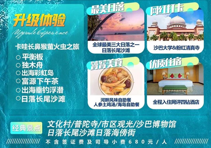 | 酒店享用早餐,后前往位于沙巴亚庇旧皇宫山上的【沙巴博物馆】 拥有丰富的历史纪录珍藏,为历史非常悠久的沙巴景点之一,展览沙巴各族原住民的住宅、传统狩猎工具等等,更陈列了不少彷佛叙述著个别独特故事的乐器、工具和祭祀用品、装备或配件。在博物馆院内,距离主体建筑不远的地方,是一个多元文化村。这座文化村的特色是模仿沙巴各原住民的传统居所特征,建成许多房屋,公开让访客进入里头的每一个房间、厅堂参观探索,而每一间房屋也都有各自的摆设,甚至有真人在示范起居作息,使用工具的真情实景,使访客感觉如同身入其境。参观选购惟妙惟肖的各类精美珍珠饰品, 【海洋珍宝】参观选购惟妙惟肖的各类精美珍珠饰品,可选择当地珍珠、水晶等饰品,【网红巧克力工厂】可以选到口感极佳的巧克力,以及各色沙巴当地的土特产,请尽情享受这眼花撩乱、采买伴手礼的最佳时机。【KAWA 星空蓝美湾红树林湿地梦幻之旅】(由于自然景观,受天气因素影响,观感存在差别)。在这里,乘船游河深入这片热带雨林探索稀有的野生长鼻猴, 您定会被他的顽皮和独特所迷倒,原来世界上还有长成这样子的猴子。偶尔还能发现其他稀有猿猴的踪影,如果天气允许,返航时能目睹红树林中夕阳西下的浪漫景致。日落漫步长尾沙滩。晚餐后再次回到红树林中寻觅萤火虫的踪影,如果运气好,我们将仿佛置身童话世界般梦幻景致,感受星斗和荧光伴随的一个独特夜晚。后返回酒店休息。 |