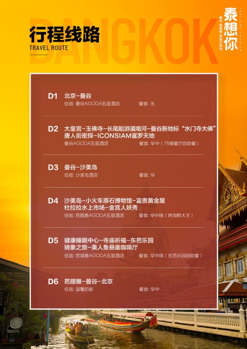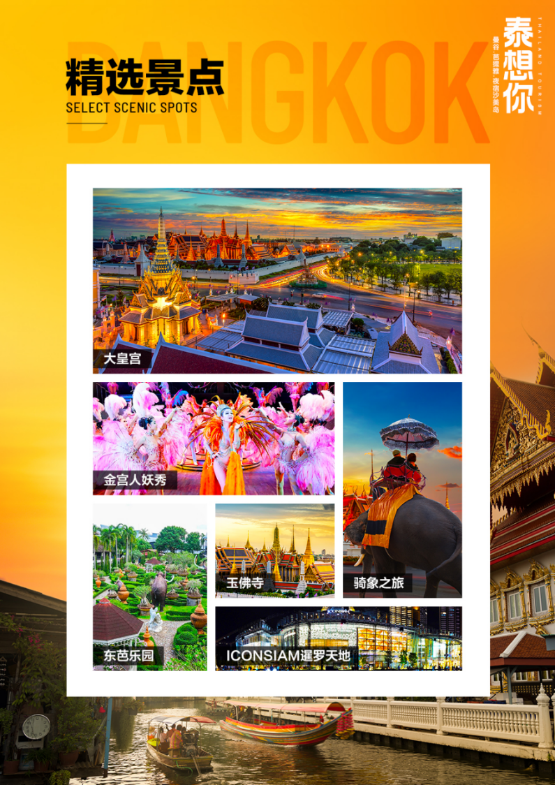 | 1.【大皇宫+玉佛寺】早餐后,前往泰国标志建筑【大皇宫】,是泰国历代王宫保存最完美、规模最大、最有民族特色的王官,被称为“泰国艺术大全”,与大皇宫相邻,是全泰国唯一没有僧侣住持的佛寺,供奉着一座价值连城的国宝—玉佛,是泰国的三大国宝之一。2.【长尾船游湄南河】乘坐泰国独有的长尾船,畅游在湄南河中。3.【曼谷新地标“水门寺大佛”】乘坐专车前往曼谷网红新地标“水门寺大佛”高60余米,大佛后面有座白塔共有五层。4.【唐人街】前往曼谷唐人街(chinatown),自行游览中华老传统街景,同时体验唐人街的特色美食小吃。5.【ICONSIAM暹罗天地】暹罗天地ICONSIAM自开业以来,一直致力于为来自世界各地的顾客提供正宗的泰国产品,同样地,暹罗天地ICONSIAM也不乏世界级的奢侈品牌。因此,无论你是想购买泰国特色产品还是世界级的潮流尖货,都能在暹罗天地ICONSIAM找到。温馨提示: 参观大皇宫玉佛寺时男士须穿长裤,女士需穿过膝长裙,女士不可穿露背、吊带上衣及超短裙。 |