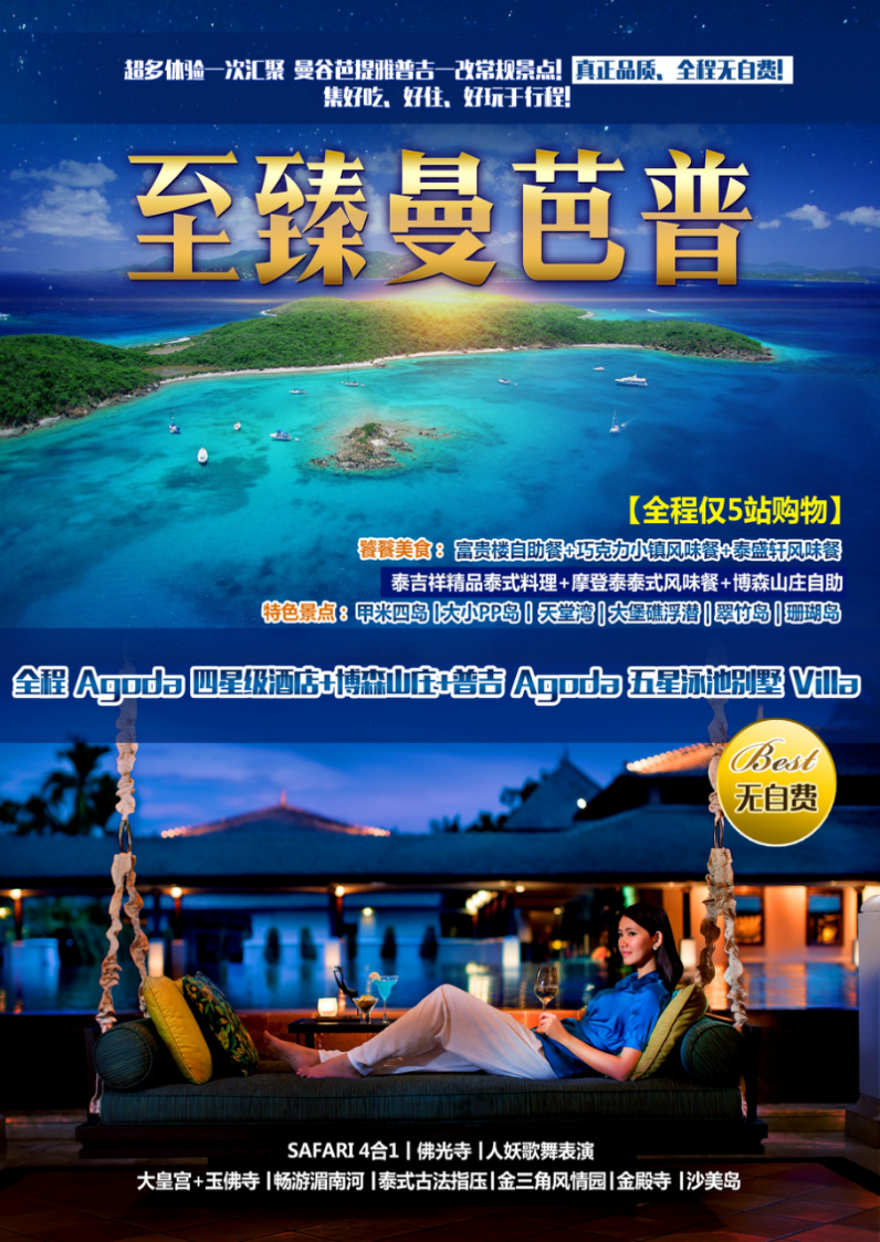 <曼巴普>曼谷+芭提雅+普吉岛8晚10日游 全程无自费 仅有五个购物店