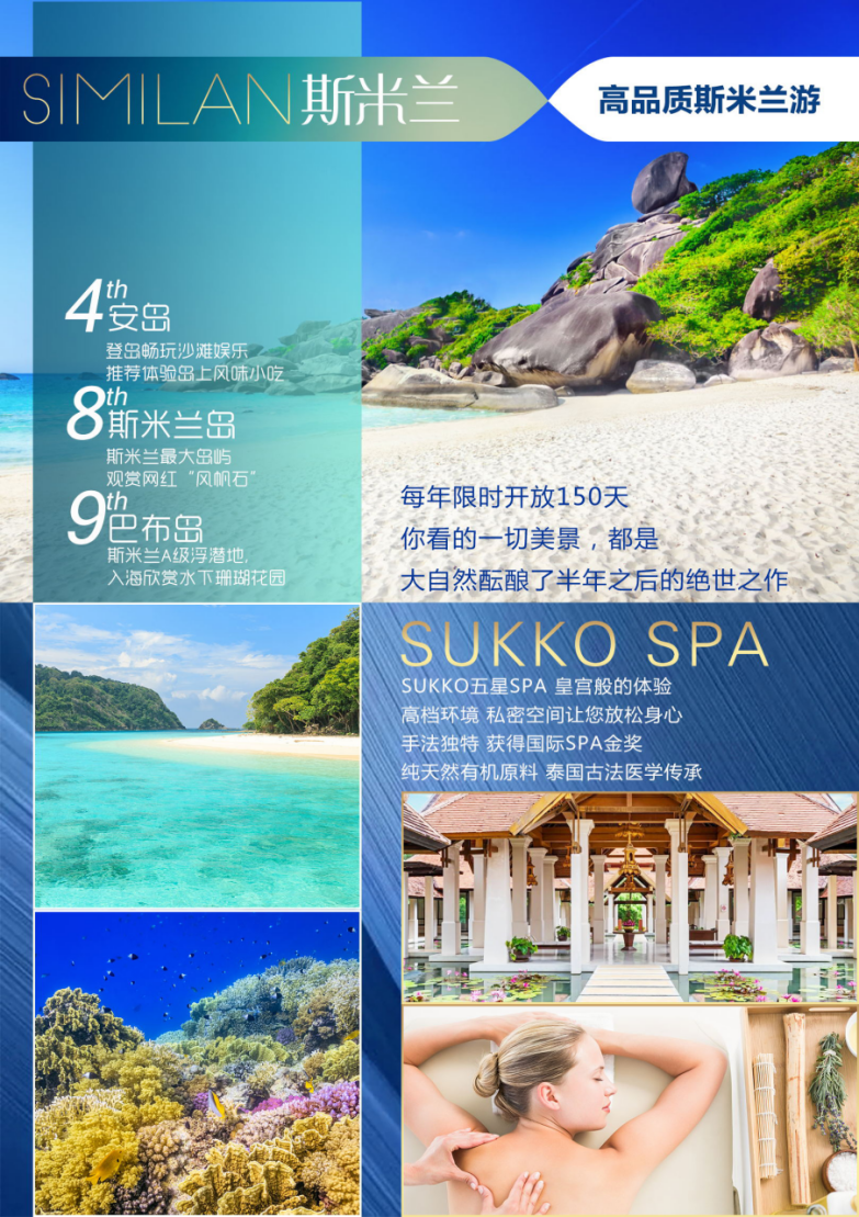 | 1、【SIMILAN斯米兰群岛】,9个岛中我们挑选了其中最美丽的4个岛,去尽情的游泳与浮潜。同时可以在银白色的沙滩上自由活动。斯米兰岛的美丽是无法用言辞来形容的,只有您的亲身体验,才能感受它的独特魅力。2、【4号安岛(Koh Miang)】,这里大片坚固的珊瑚礁高度逐渐地降低到大概30-40米,由于海水深度的增加,这个位置被沙子代替了。在这些岛屿周围形成的旋涡状的、营养丰富的水域有着大量色彩艳丽的热带鱼, 在这些水域观赏到巨大鱼儿的机会是很少的,但是在这你也许会偶然碰到美洲豹鲨鱼,甚至鲸鱼。这里有二十多处合格的潜水点,有许多已发展起来拥有自己的国际声誉。之后前往3、【9号班古岛(Koh Bangru)】上的【圣诞角(Chrismas Point)】,这里是以系列蜿蜒迷人的海湾而得名,多彩成群的蓝鳍鲹,金枪鱼穿梭其中,潜水爱好者您不妨体验畅游其中的乐趣。后乘快艇往4、【8号斯米兰岛(Koh Similan)】享用午餐,8号斯米兰岛上的象头岩(Elephant Head)可能是这群岛屿中最著名的潜水地带,这里是以伸出海面到斯米兰岛西南角的、形状不规则的岩石而命名的。【仙境(Fantasy Reef)】, 是适合于勘探大量水下岩石形成的受欢迎的地点,同时在这也能碰到一些活的发光物体。我们可以在这里进行【浮潜】,一览海底世界丰富的鱼群,及五彩缤纷的珊瑚。 5、【精油spa】随后将带领各位贵宾前往本公司特别安排的spa『60分钟』,来一次经典葛优躺,享受舒筋活骨、消除疲劳之神奇疗效。(小費:100珠请交給帮你按摩舒服的按摩师,谢谢您)。①:(因海上风浪大,如当天不能乘坐快艇出海则会安排其它行程替换)②:如果遇到当天下雨或者风太大时,则改为在室内餐厅用餐;另外本日建议游客请事先准备小型旅行包,带些轻便的换洗衣物前往离岛,大件行李可放在普吉本岛酒店内寄存。近期泰国海上风浪较大的季节,为保证游客出行的安全,泰国水警发出警告:60岁以上客人不能过海,上岛费用不退。早:酒店含早餐 中:岛上简餐 晚:白金古日式料理 |