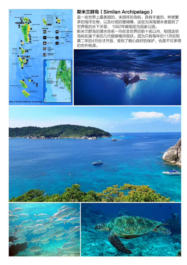 | 斯米兰群岛Similan Island特别提示:今日前往斯米兰出发时间较早。(早餐打包)乘车前往码头,乘快艇前往【SIMILAN斯米兰群岛】,9个岛中我们挑选了其中最美丽的4个岛去尽情的游泳与浮潜。斯米兰岛的美丽是无法用言辞来形容的,只有您的亲身体验,才能感受它的独特魅力。【4号安岛(Koh Miang)】,SIMILAN斯米兰群岛中最美丽的岛屿,这里大片坚固的珊瑚礁高度逐渐地降低到大概30-40米,由于海水深度的增加,这个位置被沙子所代替了。在这些岛屿周围形成的旋涡状的、营养丰富的水域有着大量色彩艳丽的热带鱼, 在这些水域观赏到巨大鱼儿的机会是很少的,但是在这你也许会偶然碰到美洲豹鲨鱼,甚至鲸鱼。这里有二十多处合格的潜水点,有许多已发展起来拥有自己的国际声誉。【 9号班古岛(KohBangru)】上的圣诞角(Chrismas Point),这里是以系列蜿蜒迷人的海湾而得名,多彩成群的蓝鳍鲹,金枪鱼穿梭其中,潜水爱好者您不妨体验畅游其中的乐趣。【8号斯米兰岛(Koh Similan)】岛上的象头岩(Elephant Head)可能是这群岛屿中最著名的潜水地带,这里是以伸出海面到斯米兰岛西南角的、形状不规则的岩石而命名的。【7号岛有个仙境礁(Fantasy Reef)】, 是适合于勘探大量水下岩石形成的受欢迎的地点,同时在这也能碰到一些活的发光物体。我们可以在这里进行【浮潜】,一览海底世界丰富的鱼群,及五彩缤纷的珊瑚。温馨提示:斯米兰群岛,7号/9号岛无法登岛,午餐在4号或8号岛上用餐,具体以当天实际情况为准。早餐:酒店内早餐 午餐:岛上简餐 晚餐:大富豪泰风味餐 |