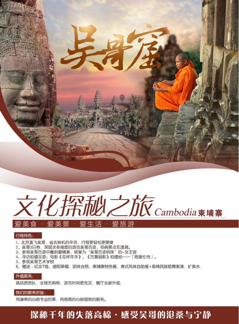 | 参考航班 ZA457(1940-0115+1) 自由活动,您可以自由自在安排您的行程。之后乘车前往吴哥机场乘机返回北京,结束愉快的柬埔寨之旅!(温馨提示:如外出游览,请您尽量结伴出行,并请您提前告知领队导游您的有效联系方式,自由活动期间,请您自行负责个人财产及人身安全!) |