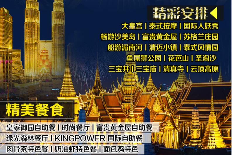 | 1、【宏愿之声,佛都遗韵】早餐后,前往泰国标志建筑【大皇宫】,是泰国历代王宫保存最完美、规模最大、最有民族特色的王官,被称为“泰国艺术大全”。2、【玉佛寺还夙愿】与大皇宫相邻,是全泰国唯一没有僧侣住持的佛寺,供奉着一座价值连城的国宝—玉佛,是泰国的三大国宝之一。3、【华彩泰国,大理石寺】大理石寺主殿是泰皇拉玛五世时所建造的,您能欣赏到僧侣肃穆的梵唱。大理石寺的另一项特色是金和漆交错的梁柱,非常精致细腻,在宽广的大殿中,您还可以欣赏到一列靠墙而立的青铜佛像。4、【乘舟而上,访湄南河畔悠扬】从河城码头一号口出发,沿途经过湄南河上经典的风光带。著名的拉玛一世大桥、郑王庙、大皇宫等曼谷地标在湄南河粼粼波光的映衬下,显得格外迷人。5、【艳绝众生,国际人妖秀】去往泰国最精彩的人妖秀,泰国人妖在历史上就是专为歌舞而培训,因人妖天生具有强烈表演欲,至今人妖歌舞表演已经到达巅峰,雌雄难辨、精彩纷呈的演出保证让您终身难忘。6、【古法按摩,“泰”奇妙(1小时)】为泰国古代医学文化之一,拥有四千多年历史,源远流长。古代泰国皇族利用它作为强身健体和治疗身体劳损方法之一。一小时解除一天舟车劳顿的疲乏和辛苦(未满16岁儿童不能参加此项目,自愿放弃该项目的团友视为自愿放弃,不退费用,按摩小费需要自理)。 |