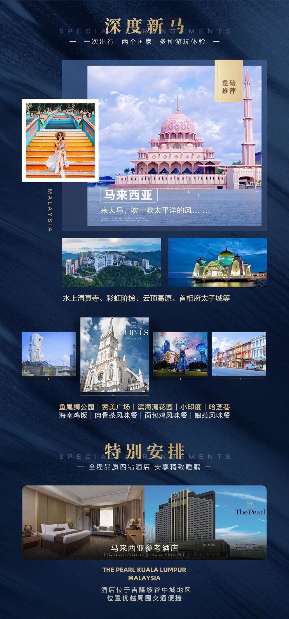 | ※【黑风洞彩虹阶梯】(约 40 分钟)黑风洞是印度教的朝拜圣地,是一个石灰岩的溶洞群,被称为世界上最神秘最美的洞穴之一,它处在一个丛林掩映的半山腰,通过 272 级陡峭的台阶,就可以看到石柱、石笋、天坑等卡斯特洞穴地质现象。而黑风洞的 ins 风拍照打卡胜地,就是它那排长且陡峭的阶梯。经过 2018 年夏天的“楼梯换装”,这排陡峭的阶梯变得五颜六色,十分上镜,远远看去就像一道彩虹,所以又被人叫做“彩虹阶梯”。在彩虹阶梯前面还矗立着一座 140 英尺高的镀金印度大佛——战神穆鲁干的巨大塑像,非常壮观哦。拍照建议:如果是拍全景,需要退到广场上,如果是拍阶梯局部,最好是配上长焦镜头。※【云顶高原】(约 2-3 小时)。素有“南方蒙地卡罗”之美誉的云顶高原,是马来西亚旅游的第一大品牌;高原上娱乐设施齐全,常常令人流连忘返。云顶高原,海拔约 2000 公尺,全年气温于 22℃左右,是马来西亚最大、最著名的的娱乐中心和避暑圣地。如遇云顶缆车维修,将改接驳车前往山顶。※【首相府~未来太子城】(约 50 分钟),在此您可感受到马来西亚政府如何不花一毛钱在森林开发区建出一座面积 264平方公里的未来马来西亚行政电子中心。未来环保无烟城市以马来西亚首位总理的名字命名,满眼尽是浓浓的绿意,道路两旁被一棵棵大树包围着,排列成一条长长的林荫大道,这条全长 4.2 公里的绿色大道,也正是举行国家庆典和阅兵游行的场地,首相府占地面积相当大,其中包括:首相官邸、水上清真寺及行政中心等。※【粉红水上清真寺】(约 20 分钟)该寺位于马来西亚新行政中心布城,整座寺有四分之三建筑在布拉特湖上,也被人们称为水上清真寺。因其顶部花岗石砌成的粉红色屋顶,视觉效果超棒。 |