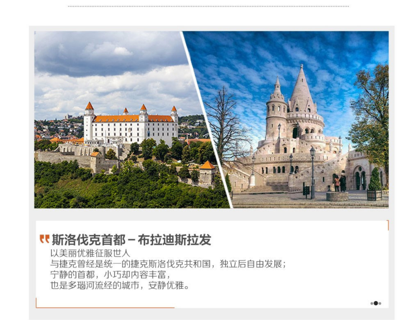 | 酒店内享用早餐,乘车前往布拉迪斯拉发,游览布拉迪斯拉发巴洛克式的老城(以下景点游览时间共约2小时:):布拉迪斯拉发城堡(外观),市中心最大的广场,建于1527年是城里最古老的喷泉--罗兰喷泉。建于1421年的老市政厅,大主教夏宫外观,米榭尔门是古城墙里保存下来的唯一一座中世纪的城门。之后乘车前往布达佩斯,布达佩斯城市游览(约2小时),蓝色的多瑙河穿城其间,许多古老的建筑群被列为世界文化遗产。首先外观位于佩斯的国会大厦和圣伊斯特万大教堂;接着外观由狮像镇守的链子桥、远眺伊莉莎白大桥;然后参观位于布达的渔夫堡(外观),外观历代匈牙利王加冕的教堂马加什教堂,最后游览矗立着匈牙利建国千年纪念碑的英雄广场,它是匈牙利人的英雄圣地,是一个融合了历史和艺术的胜迹。晚餐后,入住酒店休息 |
