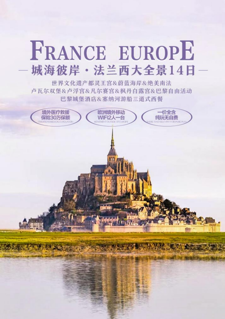 | 07:00 酒店内享用早餐;08:00 乘车前往诺曼底圣米歇尔山(车程约 270 公里)11:00 游览(约 3 小时)圣米歇尔山是天主教的第三大圣地之一,位于芒什省的一座小岛上。1979 年被联合国教科文组织列为世界文化遗产。小岛呈圆锥形,它所在的圣马洛海湾是一片滩涂,潮汐不断地将沉积物冲上岸,使得圣米歇尔山成为了一座孤岛,颇具神秘色彩。为了方便游览,午餐敬请自理;15:00 乘车前往法国小镇;(车程约为 280 公里)19:00 抵达后,享用晚餐,中式七菜一汤; |