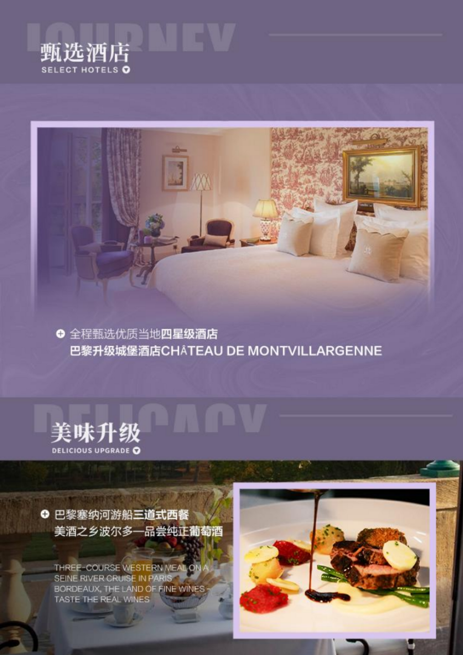 | 08:00 酒店享用早餐;09:30 登巴黎最高的建筑-210 米高的蒙帕纳斯大厦观景台 59 层顶楼露台*VR 装置带您体验穿越巴黎时光之旅;市区游览(以下景点游览时间约 1.5 小时):远眺闻名世界的艾菲尔铁塔(不上塔);游览凯旋门,这里是香榭丽舍大道的起点,也是巴黎主要庆典活动的起点,以凯旋门为中心,放射出去的 12 条街道,犹如十二道光芒,映射着这座光芒四射的城市,香街的另一端是世界上美丽的协和广场;12:30 尊享午餐,塞纳河游船午餐三道式西餐;13:30 参观世界三大博物馆之一卢浮宫*(入内含门票,中文讲解 120 分钟,游览总计时间约 3 小时),这个建筑的本身就是艺术杰作,它坐落在塞纳河中心的北岸,在这座艺术殿堂里您可欣赏到镇馆三宝:蒙娜莉莎的微笑、维纳斯雕像和胜利女神像;(温馨提示:卢浮宫定位紧张,以实际预定入内时间为准,如遇周二闭馆,则调整行程前后顺序,敬请谅解)。剩余时间自由活动;18:00 享用晚餐,中式七菜一汤;19:00 入住酒店休息。 |