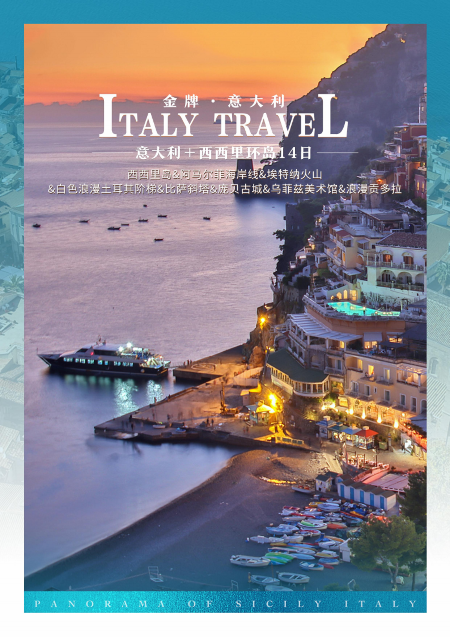| 07:00 酒店享用早餐;08:00 乘车前往波斯塔诺(车程约 60 公里);09:00 阿玛尔菲海岸重要城市-波斯塔诺,由于阿马尔菲海岸满是悬崖的地理特质,使得小巴车或是乘坐渡船成为到达这里的公共交通工具(以实际预定为准)。这里被联合国地理杂志评为一生中值得去的 50 个地方之一,拥有着意大利乃至全世界迷人的海岸线。波西塔诺(游览约 2 小时)这座千人小镇矗立于坎帕尼亚的阿马尔菲海岸悬崖上,引人入胜的城市。一位作家这样形容:波西塔诺是一个梦乡,你在时,她不是很真切,你离开后,她变的栩栩如生。摩尔风格的建筑物竖立在陡峭的山坡上,俯瞰着赛伦纳斯群岛。10:30 渡船前往苏莲托,苏莲托这座坐落在海滨峭壁蜿蜒曲折的小镇。在碧蓝的地中海海与广袤无垠的天空衬托下,这里的一切都是那么的美丽迷人,淡淡的海风,加上怡人的气候优美的自然风光,让您忘却一切烦恼与压力,沉醉在这座魅力小镇;午餐敬请自理;安全提示:海边多悬崖峭壁,不适宜下海游泳,请您切勿下海游泳,并远离悬崖等危险地区;15:00 乘车返回那不勒斯(车程约 48 公里);17:00 享用晚餐,中式七菜一汤;(温馨提示:根据渡轮时刻,有退餐可能);18:00 搭乘海上渡轮前往意大利西西里岛首府巴勒莫;夜宿游轮船上;参考船班信息:Napoli- Palermo 20:15(以实际预定时间为准)温馨提示:夜游轮轮渡时刻根据实际预定为准。往返西西里岛特色体验夜游轮夜宿(2 人外舱),遇到强风雨天气状况,如若有晕船的习惯,可提前预备晕船药或晕船贴; |