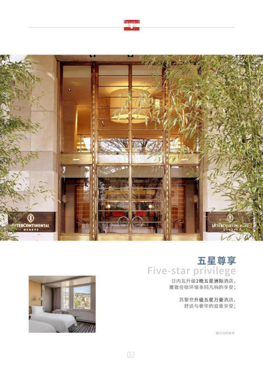 | 参考航班信息:CA861 PEKGVA 0225 0715 (以出团通知为准)02:25 乘坐中国航空公司班机,直飞日内瓦;07:15 抵达日内瓦机场,提取行李,我们将安排机场专车接机。10:00 美丽的日内瓦位于瑞士西部日内瓦湖畔,日内瓦中心城市包含小城市和国际都市两种不同面貌,它是红十字国际委员会的发源地,被称为秉承博爱主义传统的和平之都。12:00 享用午餐;13:00 日内瓦绝大部分的历史都记录在老城中(约 1.5 小时),游览欧洲最大的湖泊-日内瓦湖,日内瓦湖上大喷泉(外观)是日内瓦象征,喷起 140 米高的水柱,位于日内瓦湖畔的英国公园的花钟是日内瓦作为钟表产业中心的象征,外观游览联合国欧洲总部以及国际红十字会。17:00 乘车前往酒店,办理入住休息;今日为了考虑到您及孩子的休息,因而尽早安排您入住酒店,晚餐敬请自理,谢谢! |