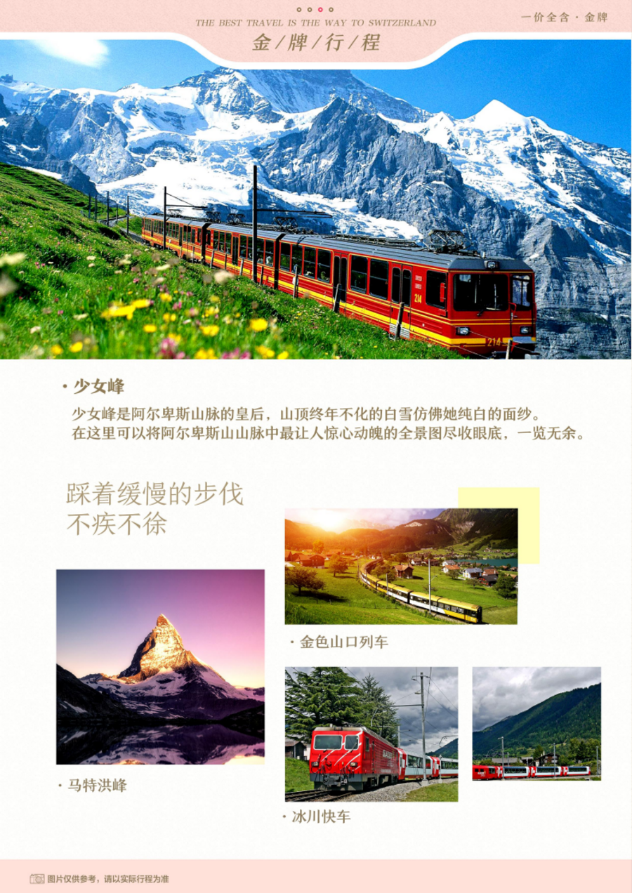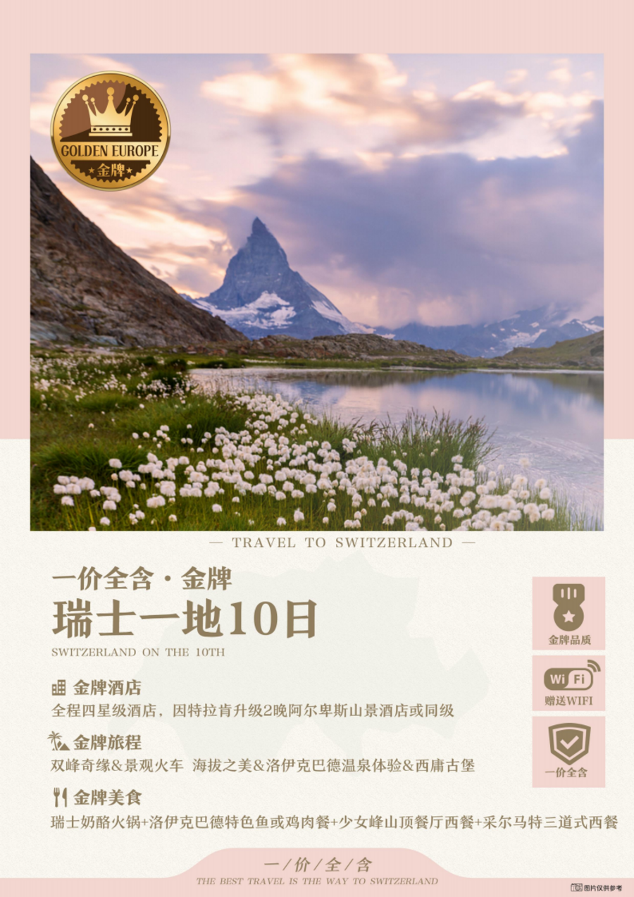 <瑞士一地10日游>马特宏峰/冰川快车/金色山口快车/少女峰/ 西庸古堡/阿尔卑斯温泉
