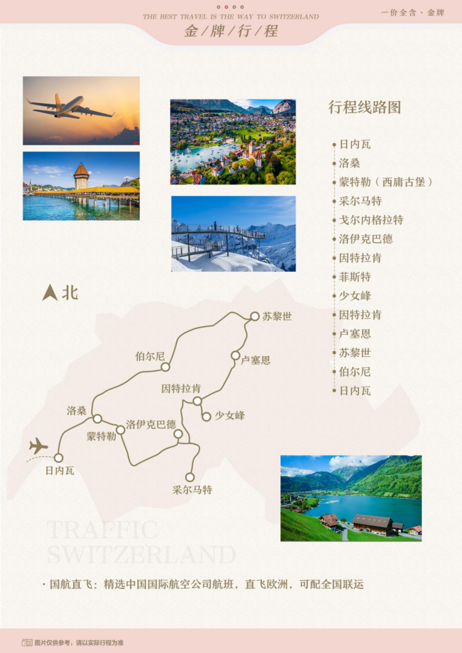 | 05:30 抵达北京,回到温馨的家,结束愉快的瑞士之旅……*请将您的护照交给领队以便销签,如果您被通知面试销签,请配合领队前往使馆面试 |