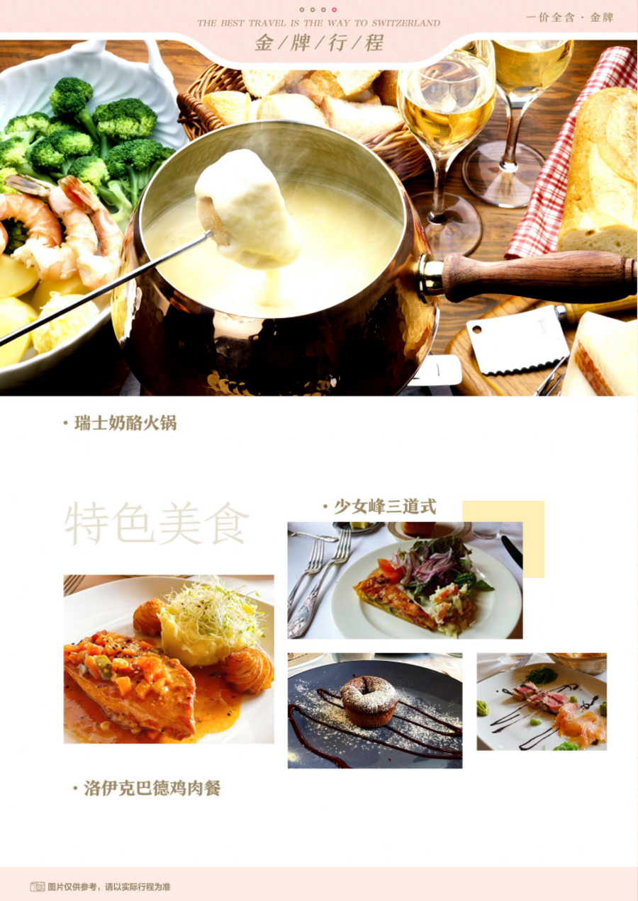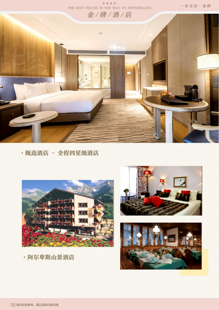 | 参考航班信息:CA861 PEKGVA 0225/0715 (以出团通知为准)02:25 乘坐中国国际航空公司班机飞往瑞士日内瓦;07:15 抵达日内瓦机场,提取行李,我们将安排机场专车接机;09:00 乘车前往法国依云小镇(车程约 50 公里);10:30 依云小镇(以下游览时间约 45 分钟),依云 Evian 小镇位于法国罗纳 - 阿尔卑斯大区的上萨瓦省北部艾维昂勒邦地区,距离日内瓦 45 公里,海拔高度 438 米。依云镇的特点是宁静和安详。您可以轻松的悠然漫步于小城中享受这里的安逸和宁静,感受逃离大都市的喧嚣与嘈杂;11:00 享用午餐,六菜一汤;13:00 游览日内瓦湖,湖中的大喷泉是日内瓦的象征。联合国欧洲总部(外观)、国际红十字会(外观),剩余时间自由活动,之后返回日内瓦;18:00 享用晚餐,酒店三道式西餐;20:00 入住酒店休息;今日为了考虑到您及孩子的休息,因而尽早安排您入住酒店,谢谢! |
