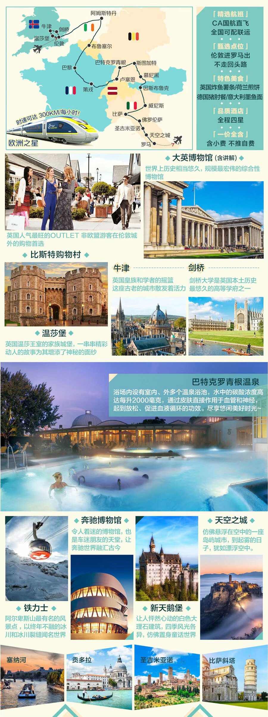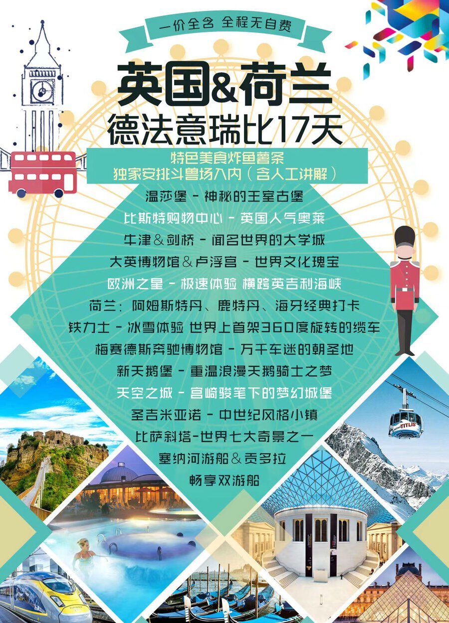 <英国+西欧连线>英国+荷兰+德法瑞意比17日游 国航直飞 一价全含