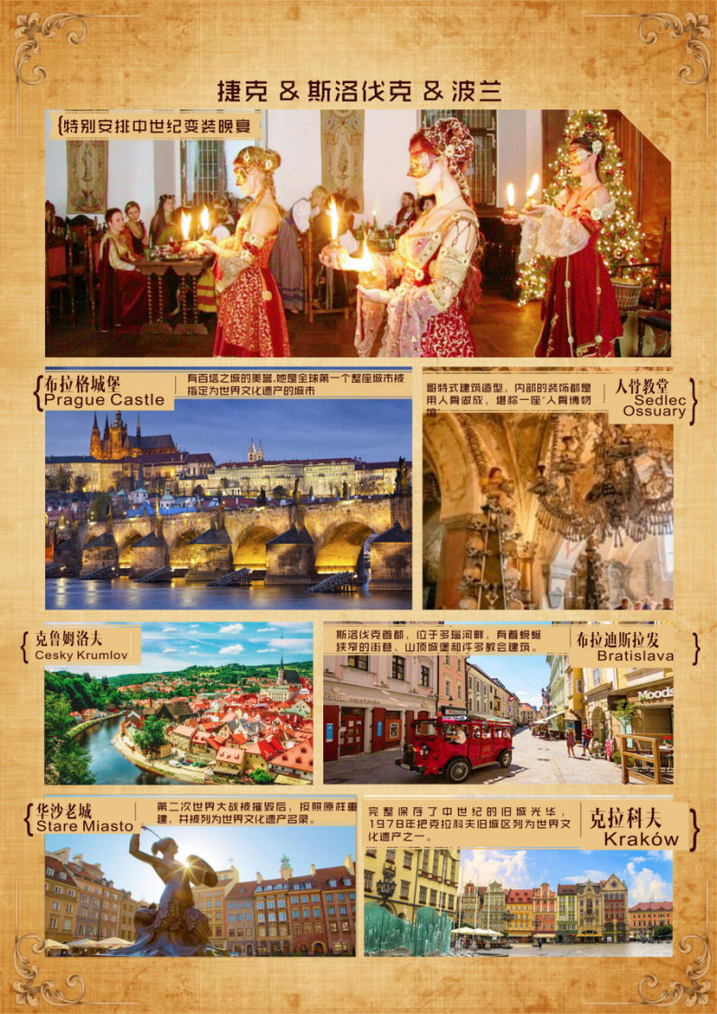 | 07:00 酒店内享用西式早餐;08:00乘车前往库特纳霍拉,小城在14世纪因开採白银所带来的财富与地位,所辉映出现今仍存的中世纪之古城,1995年列入了联合国教科文组织世界文化遗产。抵达后参观圣芭芭拉教堂{,教堂最值得观赏的是其外墙扶壁臂线条优美纤细,墙上雕刻精致华丽,因此成就为欧洲最美丽的歌德式大教堂之一。参观人骨教堂{,教堂很小,其外表是看似十分普通的哥特式建筑造型,但内部由约40000块人骨修建及装饰,因此这里与其说是教堂,倒不如说是“人骨博物馆”。12:00午餐,六菜一汤;13:00乘车前往捷克首都-布拉格,抵达后游览布拉格古城,位于伏尔塔瓦河东岸,布拉格发源的古城。是现今游人必到的游览景点。老城广场,位于瓦茨拉夫广场和查理大桥之间。又因其为布拉格最富名气的广场,往往被直称为布拉格广场;天文钟,位于老城市政厅的哥特式钟塔上;老市政厅,布拉格老市政厅在布拉格老城广场上,城市政厅–成立于西元1338年,为布拉格第一座城市自治的象征;泰恩教堂,布拉格老城区的代表建筑,自14世纪起就是该区的主要教堂。教堂的钟楼高达80米,塔顶是四个小尖顶。火药塔,火药塔是宏伟进老城的入口处以及布拉格著名象征之一;市民会馆,市民会馆是布拉格的音乐厅和地标建筑,在捷克共和国的建筑和政治史上都是一座重要建筑。它座落在旧城与新城之间的共和国广场.18:00晚餐,六菜一汤;19:00前往酒店休息。 |