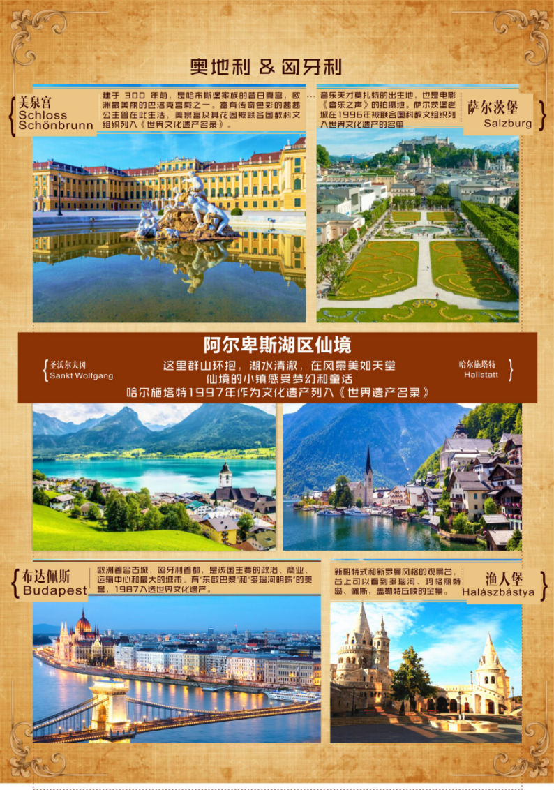 | 08:00酒店内享用西式早餐;09:00乘车前往莫扎特故乡萨尔茨堡,阿尔卑斯山的秀丽风光与丰富多彩的建筑艺术浑然一体,使萨尔斯被誉为全世界最美丽的城市之一,老城被列为世界文化遗产,沿着多年前那令人无数世人痴迷的影片《音乐之声》的痕迹,体验这座城市的音乐精髓。12:00午餐,六菜一汤; 13:00游览米拉贝尔花园其中最令游客印象深刻的是以希腊神话为主题的雕像、此起彼落的喷泉及花团锦簇的花坛,电影『真善美』中高歌Do Re Mi的场景就在此拍摄的。外观莫扎特故居,莫扎特的出生地及渡过青少年时期的地方,莫扎特曾在此创作出许多作品。莫扎特广场,莫扎特广场位于主教广场东北侧,广场上的莫扎特塑像由萨尔茨堡人捐款于1842年9月5日落成, 莫扎特的两个儿子出席了落成典礼。远观萨尔茨堡城堡,萨尔茨堡城内的标志性建筑,位于老城区山上,历史悠久,始建于1077年,由历任总主教逐步扩建而成,是欧洲最大的中世纪城堡之一。16:00乘车前往沃尔夫冈湖区;它是奥地利阿尔卑斯山区最美的湖泊,12个大大小小的湖泊串联在一起,宛若珍珠一般,百年前奥地利皇后茜茜公主常来此避暑,安排沃尔夫冈湖区活动时间30分钟,18:00 晚餐,六菜一汤19:00特别安排入住湖区酒店 |