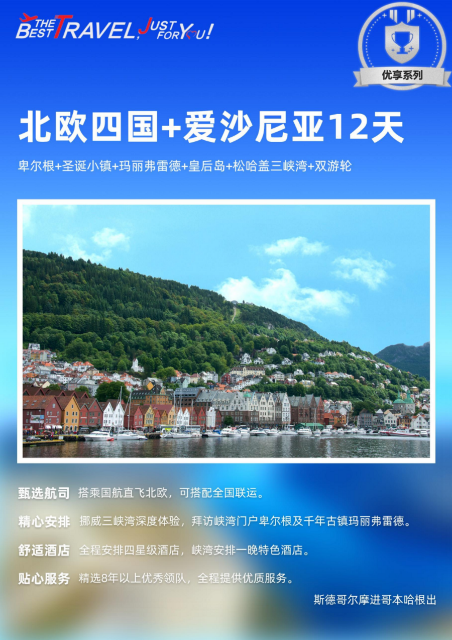 <北欧四国+爱沙尼亚12天>卑尔根+圣诞小镇+玛丽弗雷德+皇后岛+松哈盖三峡湾+双游轮