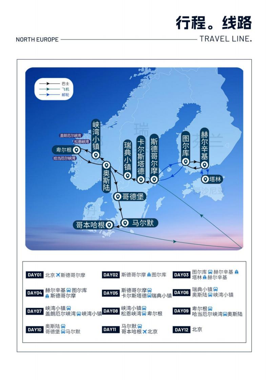 | 08:00 酒店早餐后,游览赫尔辛基市区景点,景点游览时间约 2 小时。12:30 午餐在中餐厅享用六菜一汤中式菜肴。13:30 午餐后继续游览赫尔辛基景点,景点游览时间约 2 小时。15:00 乘车前往芬兰城市图尔库,抵达后游览图尔库城堡。18:00 晚餐在中餐厅享用六菜一汤中式菜肴,晚餐后前往码头办理登船手续,搭乘邮轮横跨波罗的海至斯德哥尔摩。景点介绍:岩石教堂(外观) 教堂内壁是未经任何修饰的岩石的本来面貌。顶部的墙体是用炸碎的岩石堆砌而成,原始的色调给教堂增添了回归自然的感觉。金碧辉煌的拱顶反射着下面的烛光,使整个教堂富有艺术感染力。Oodi 图书馆(入内参观约 30 分钟)【独家景点】OODI 是一个新时代的图书馆,是一个面向所有人开放的非商业性城市公共空间。它是一个活动场地,一个阅读天堂,一个多样化的城市体验。它体现着芬兰社会的核心价值观:教育&文化的平等和开放。赫尔辛基火车站(外观)赫尔辛基中央火车站位于赫尔辛基市中心,是由芬兰著名建筑师埃利尔· 萨里宁设计。火车站的正中心是一个大大的半圆形拱顶设计,古老的砖墙让这座大型建筑的年代感十足。车站内部的华丽旧式吊灯与外部的巨型雕像手捧灯球,一定会让你有种心为之动、神为之夺的惊艳感。议会广场 赫尔辛基市民活动的中心,也是欣赏新古典主义建筑的最佳场所,被视为芬兰的重要地标。广场的中心是塑于 1894 年的沙皇亚历山大二世铜像,以纪念他给予芬兰充分的自治。站在广场上就可以看到建筑大师恩格尔的三件杰作:大教堂、政府大楼和赫尔辛基大学。广场东南角是芬兰最古老的石楼房西德霍姆宫。赫尔辛基大教堂(入内参观约 15 分钟,遇活动及庆典无法入内,改为外观) 又称白教堂,赫尔辛基最著名的建筑,不仅是赫尔辛基的象征也是它的重要地标,建于 1852 年,结构精美,气宇非凡,堪称芬兰建筑艺术上的精华。赫尔辛基大学(外观) 芬兰世界级著名高等学府。1640 年创建于芬兰古都图尔库,1828 年迁至赫尔辛基。赫尔辛基大学以其悠久的历史,丰富的藏书,一流的设备, 齐备的专业以及杰出的成就闻名欧洲。图尔库城堡(外观) 位于奥拉河的入海口旁,人们来到这里仿佛回到了几百年前,图尔库城堡是昔日瑞典王族小居芬兰的“夏宫”,是芬兰现存的四座中世纪古城堡中,最古老的一座。 |