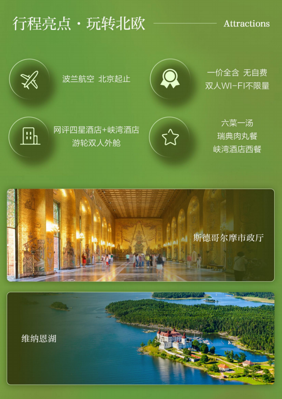 | 08:00 酒店享用西式自助早餐09:00 游览挪威民俗博览园(约 45 分钟),挪威民俗博览园是一个可以体验到挪威古老民俗风情的地方,这里有古老的木制教堂,有身着挪威各族民族服饰真人秀,生动再现几百年前古挪威人的生活,还可观赏到热情洋溢的挪威民族音乐。游览维格兰雕刻公园(约 45 分钟),占地 32 万平方公尺,整座雕刻公园是维格兰的毕生心血,主题为人生,212 件雕刻作品,600 多个雕像,象征着活生生的我们,而非博物馆内冰冷的雕塑。奥斯陆市政厅(外观)是为了庆祝建城 900 周年纪念所盖的一栋建筑,每年 12 月 10 日颁发的诺贝尔和平奖典礼就是在这举办。11:00 乘车前往瑞典首都斯德哥尔摩,途径瑞典最大的淡水湖—维纳恩湖(约 30 分钟),欧洲第三大湖,维纳恩湖位于瑞典南部,维纳什堡和卡尔斯塔德之间,于约 1 万年前的冰河时期后形成。当冰川融化时,整个瑞典的土地都被水淹没,形成卡特加特海峡和波的尼亚湾之间的一个海峡。维纳恩和韦特恩湖就于冰后回弹形成。因此,现在湖里还有一些从冰河时期遗留下来的物种,在一般的淡水湖中罕见,徜徉在湖边,尽享湖光美景,在纯净北欧留下自己的倩影。12:00 午餐,六菜一汤18:00 晚餐,六菜一汤 |