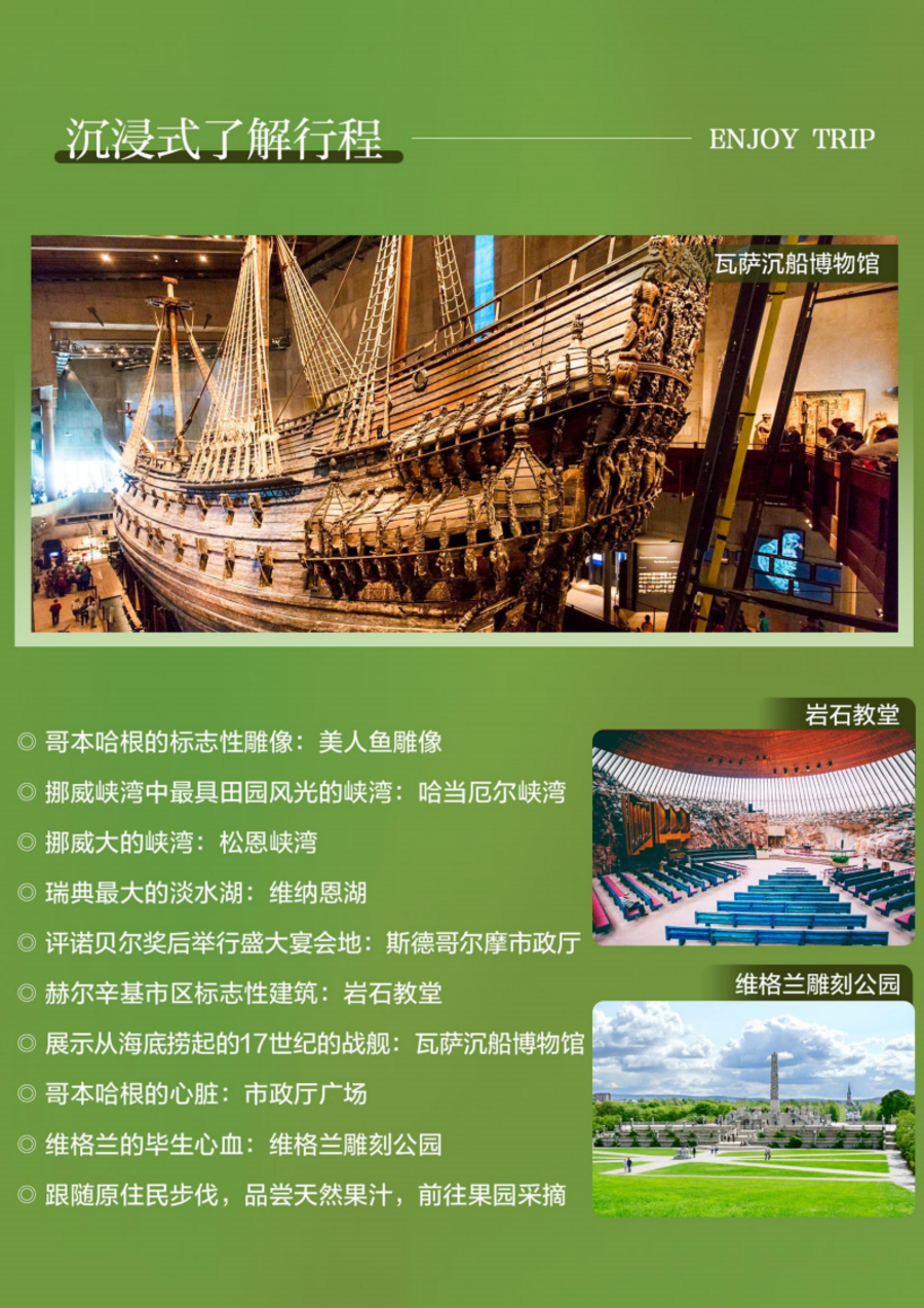 | 08:00 游轮享用西式早餐11:00 瓦萨沉船博物馆(不少于 40 分钟)是绝对不可错过的观光地,馆内展示着从海底捞起的 17 世纪的战舰-瓦萨号,300 年前海盗的生活仿佛就在眼前。12:00 午餐,六菜一汤13:00 斯德哥尔摩自由逛购,晚餐敬请自理 |