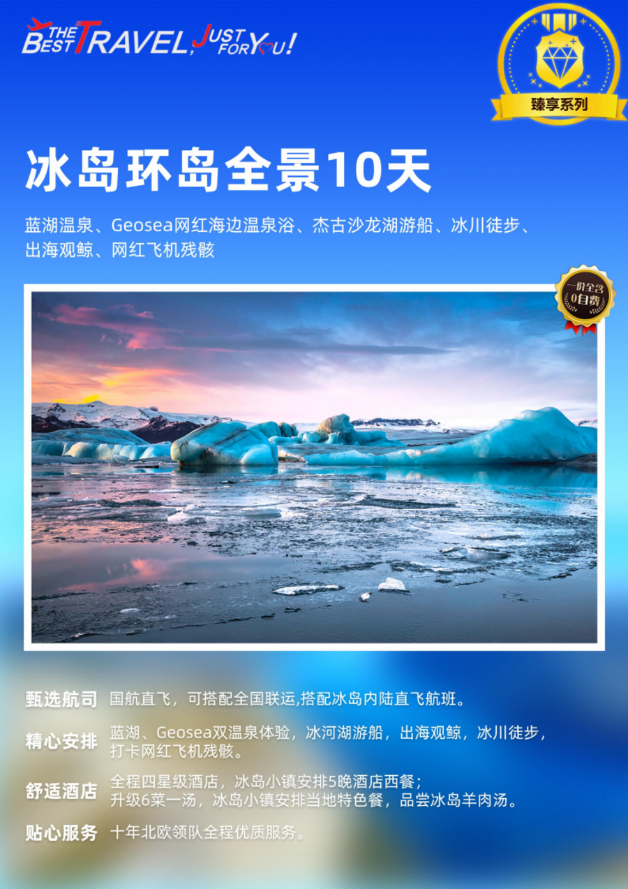 | 08:00 酒店早餐后,前往瓦特纳冰川,瓦特纳冰川是冰岛乃至欧洲最大的冰川,位于冰岛东南部,规模巨大,边缘有许多冰舌,每个冰舌又有各自的冰川名。冰川顺山体流下时,就像伸出来的舌头,顾名思义冰舌。人气很高的斯卡夫塔山地区就是分支冰川之一,电影《星际穿越》中的“曼恩”冰之星球就是在此拍摄。09:00 抵达斯卡夫塔山集合点,登上瓦特纳冰川体验冰川徒步。14:00 乘车前往杰古沙龙冰河湖,抵达后搭乘杰古沙龙冰湖游船,游览这个冰水交融的冰泻湖。16:00 乘车前往冰岛东部小镇。19:00 抵达酒店,办理入住休息。20:00 晚餐在酒店享用西式晚餐。温馨提示:当日午餐由于游览地区少有餐厅改为自理,为此给您带来的不便之处请见谅!景点介绍:冰川徒步(约 3.5 小时) 登上冰盖前,向导将首先为您介绍安全须知,为您提供所有冰川徒步的必备器材,确保您的旅行安全。冰川之上,我们的专业向导将为您介绍冰川的形成与发展,让您更加深入地了解冰岛自然之美。冰川徒步时间为 3.5 小时,我们将在冰川上体验更长时间,深入冰川内部,到达鲜有人至的冰川胜景,您还能看到冰岛的最高峰华纳达尔斯赫努克火山。瓦特纳冰川国家公园 瓦特纳冰川国家公园位于冰岛东南部,冰川之大仅次于南极冰川和格陵兰冰川。目前,瓦特纳冰川国家公园内的冰川是地球上除了极地之外较大的冰盖,令人感到奇特的是瓦特纳冰川地区还分布着熔岩、火山口和热湖,“冰与火之歌”每天都在这里上演。冰川徒步杰古沙龙冰河湖(含水陆两栖游船,游览约 1 小时)冰湖是冰川所融化的水形成的湖泊,因地处冰川河的入海口所以有大量浮冰被冲进湖里。这里的浮冰不仅仅是白色,还有蓝色,绿色,以及由于火山灰的掺杂而呈现出的棕色或灰色。搭乘水路两栖船游览杰古沙龙湖。钻石沙滩 黑沙滩上晶莹剔透的冰川融冰,来自冰岛最大的瓦特那冰原,对于低纬度生活的我们来说,海拔100m 就能亲手触碰到千年冰川是多么神奇的事情。而这些散落的“钻石”正是时间的馈赠—冰川,它们飘入大海被海浪雕琢而来.... |