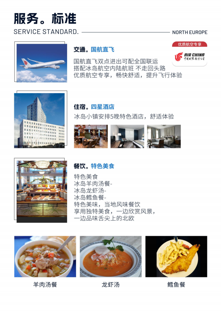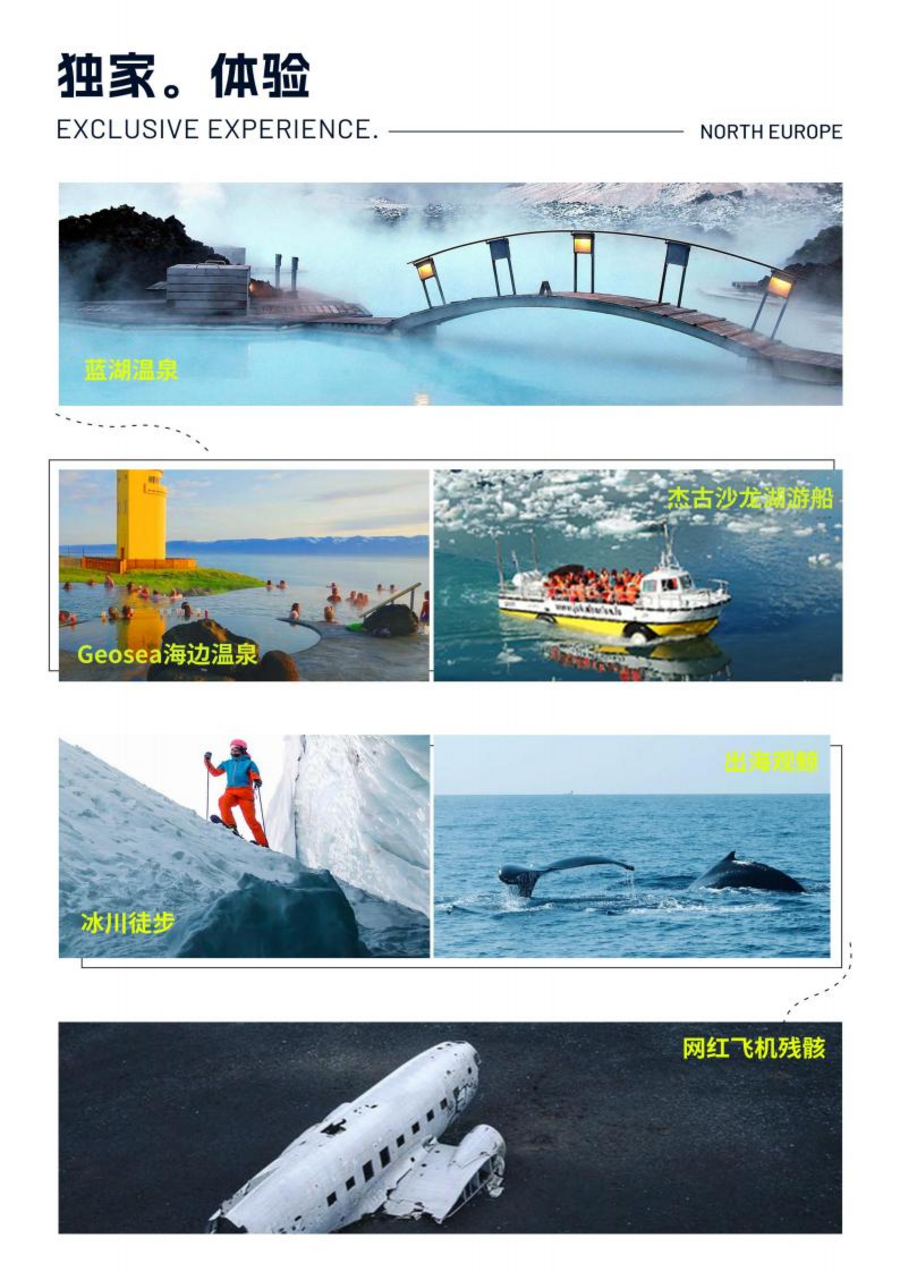 | 09:00 酒店早餐后,游览雷克雅未克市区景点。12:00 午餐在中餐厅享用六菜一汤中式菜肴。13:00 乘车前往前往世界著名的温泉疗养圣地蓝湖温泉体验。18:30 晚餐在餐厅享用冰岛特色炸鳕鱼薯条餐。19:30 前往酒店办理入住休息景点介绍:哈尔格林姆斯教堂(外观) 雷克雅未克大教堂,位于雷克雅未克市中心的山丘上,建于 1930 年,是该市的地标性建筑。以冰岛著名文学家哈尔格林姆斯的名字而命名,纪念他对冰岛文学的巨大贡献。该教堂设计新颖,为管风琴结构,教堂前的西格松雕像是为纪念冰岛独立之父西格松而建。该教堂设计新颖,为管风琴结构,主厅高 30 多米,可容纳 1200 人。雷克雅未克大教堂还有一座非常显眼的高塔,这也是其最显著的标志。珍珠楼(入内参观约 30 分钟) 珍珠楼占地 3700 平方米,历时 3 年左右建设完成。这座楼实际是个蘑菇形状。聪明的设计师把 6 个桶中间的空间充分利用,修成一个圆柱形的空间,也就是“蘑菇”的柄部,并在地面设有入口处。这个圆柱形的空间就是珍珠楼的一层、二层和三层。而四层和五层则是“蘑菇”25.7 米高的冠部。这个半圆形的玻璃穹顶由 1176 块玻璃格组成,无论是借助夏日的阳光还是冬季的月光,这座建筑都光芒闪烁,酷似珍珠。托宁湖(外观) 托宁湖是位于雷克雅未克市中心的一个小湖,尽管并不是冰岛最大的湖泊,但却是最知名的一个。托宁湖上有很多鸭子、海鸥、天鹅等野生动物,通常冬季湖面会被冰层覆盖,但是滚烫的地热水会为水鸟们开辟出一些零星的活动区域。哈帕音乐厅(外观) 哈帕音乐厅是雷克雅未克的地标之一。它是城市中心的一个文化和社会活动中心。占地28000 平方米,位于雷克雅未克一处僻静之地,这里可以看到一望无际的大海,和周围峰峦起伏的群山。光与透明性是建筑表皮的关键,变化莫测的光也构成了城市、建筑、景观之间的对话。霍夫迪楼(外观) 霍夫迪楼俗称“小白楼”,被认为是冷战结束的标志,1986 年 10 月,美国总统里根与苏联领导人戈尔巴乔夫在这幢小楼里会晤,标志着冷战的结束。霍夫迪楼始建于 1909 年。这栋平凡无奇的房子住过丘吉尔,先后接待过挪威国王、法国和意大利总统、英国和丹麦女王等。太阳航海者雕塑 太阳航海者雕塑是一个巨大的抽象钢雕塑,类似于一艘船,虽然不是维京船,但被认为是对太阳的颂歌。雕塑以不锈钢制成,设计匠心独运,仿佛以抽象元素拼接出维京海盗船骨架的神秘形态。在阳光、雨雪等不同天气下,太阳航海者雕塑都展现出不同的美感。蓝湖温泉(入内体验约 2 小时) 蓝湖温泉世界顶级疗养胜地,蓝湖所在地是地球上地下岩浆活动最为频繁的区域之一,这种活动加热了蓝湖,使得水体蒸腾。地面附近的熔岩流加热的水蒸汽用于推动涡轮机发电,经过了涡轮机的蒸汽变成热水,经过换热器又为市政热水供暖系统提供热量,可谓一举多得。蓝湖洗浴和游泳的礁湖地区水温平均在 40 ℃左右,水体有丰富矿物质,如硅和硫,在蓝湖泡温泉,可以帮助治疗一些皮肤疾病。冰岛特色炸鳕鱼薯条配传统酸奶 冰岛位于北大西洋和北冰洋交汇处,洋流带来的丰富的饵料,使得宾高渔业资源丰富,大量的鳕鱼产于冰岛周边海域。用新鲜的鳕鱼裹上 Guinness 风味面糊包裹,鳕鱼肉十分扎实,再配上薯条和冰岛传统酸奶,是当地人最爱吃的美食。 |