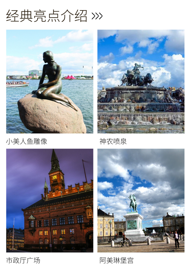 08:00   酒店早餐10:00   抵达哥本哈根码头10:30  抵达丹麦首都——哥本哈根,前往参观:美人鱼雕像(拍照留念15分钟)她是哥本哈根的象征,是一座世界闻名的铜像,她位于丹麦哥本哈根市中心东北部的长堤公园(Langelinie)。神农喷泉(拍照留念15分钟)位于哥本哈根港口的长堤公园内。神农喷泉又称吉菲昂喷泉是丹麦传统文化的杰作。游览市政厅广场,然后瞻仰举世闻名的大文豪安徒生的铜像、以及丹麦女王居住的地方阿美琳堡宫(外观)。特别赠送:玫瑰堡宫(外观)+花园(共游览约30分钟)是丹麦最著名的城堡之一,坐落在哥本哈根市北部。1606年,丹麦国王克里斯蒂安四世(Christian IV)在哥本哈根近郊修建了一个公园,称其为国王公园(Kongens Have)。这就是现在的玫瑰堡宫。12:00   午餐13:00   乘坐巴士前往德国小镇18:00   晚餐19:00   入住酒店