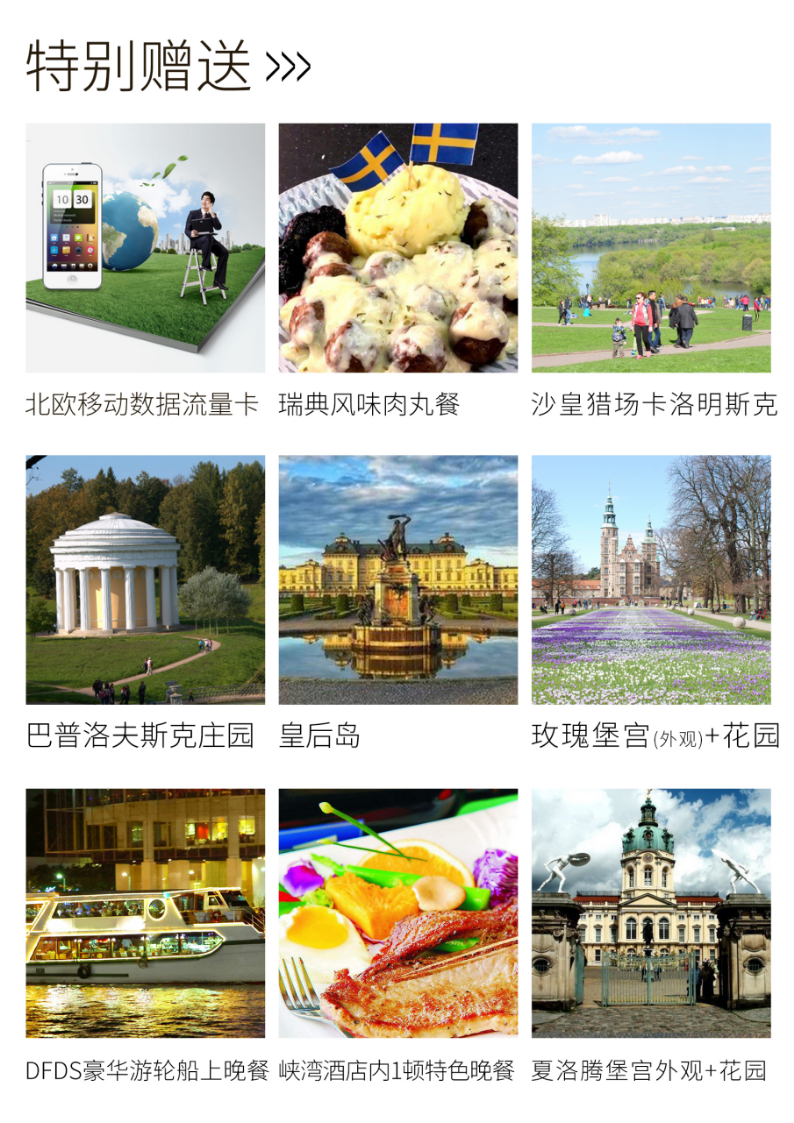 07:00   早餐08:00   前往参观,特别赠送:皇后岛 属于瑞典皇家领地,距离市中心15公里,因它的建设受法国凡尔赛宫的启发,故有“瑞典的凡尔赛”之称,是瑞典第一个被列入世界文化遗产名录的风景点。★斯德哥尔摩市政厅(入内参观约45分钟) 位于瑞典首都市中心的梅拉伦湖畔,是斯德哥尔摩的形象和代表,也是该市市政委员会的办公场所。整个建筑犹如一艘航行中的大船,宏伟壮丽。其中的蓝厅是评定诺贝尔奖后举行盛大宴会的地方。皇宫外景、老城(游览时间约15分钟) 皇宫是目前世界上仍在使用的最大的皇家宫殿。如今,这里是瑞典国王办公和举行庆典的地方,老城1980年前官方名称为“桥间之城”(Staden mellan broarna),它的历史可追溯至13世纪。城内有中世纪小巷、圆石街道和古式建筑,深受北日耳曼式风格影响。特别赠送:骑士岛是瑞典斯德哥尔摩市中心的一个小岛。该岛是斯德哥尔摩老城的一部分,拥有许多17世纪以来的私人宫殿。主要地标是皇家葬礼教堂骑士岛教堂,自从16世纪以来的许多位瑞典君主都埋葬于此。12:00  午餐13:00  前往参观维纳恩湖(拍照留念约15分钟) 此湖是北欧最大的湖泊,也是欧洲第三大湖,排名在俄罗斯的拉多加湖(Ladoga)和阿尼加湖(Onega)之后(游览15-20分钟)。后乘车前往瑞典小镇。18:00  晚餐19:00  入住酒店