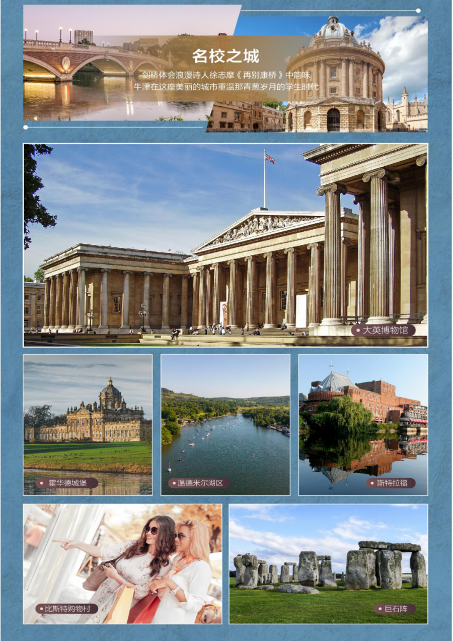 | 08:00 酒店享用早餐;09:00 乘车前往牛津(车程约 40 英里);10:00 游览牛津大学城(约 1 小时),牛津大学有近 40 个学院,分布在牛津城的各个角落。八百年来陆续修建的大学城连砖瓦树木都染上了学术气息,令人沉醉在历史的情怀里;您可以在这感受一下牛津这座城市特有的城市氛围;12:00 享用午餐,中式八菜一汤;13:00 比斯特购物村,乐享自由购物约 2 小时(晚餐自理),曾被誉为“伦敦郊外时尚气息的街区”,又称为名店村, 90 多个品牌在此设有 outlet 专卖店,从 Bally、Dior、PaulSmith 等高档时装,到 Puma,Diesel、Camper 等休闲品牌,以及 TAGHeuer、FolliFollie 等钟表珠宝,约 100 多个世界知名品牌在此集合;领队事先约定时间集合;16:00 乘车返回牛津(车程约 40 英里);18:00 入住酒店休息; |