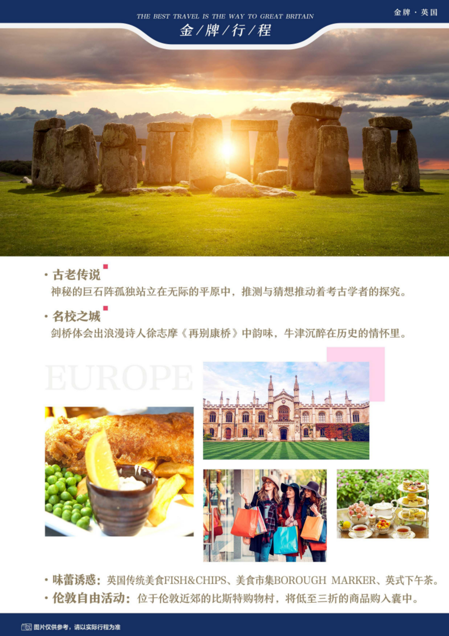 | 08:00 酒店内享用早餐;08:30 乘车前往巨石阵(车程约 50 英里);09:30 游览巨石阵*(含首门票,游览约 1 小时)遗址堪称英国最为神圣的地方之一,巨石阵是英国最为著名同时也最令人费解的纪念碑,有关第一批神秘青石被运至巨石阵的具体日期,到现在也没有一个可信的说法;11:00 享用午餐,中式七菜一汤;12:00 乘车前往比斯特购物村(车程约 82 英里);13:30 抵达后在声名显赫的比斯特购物村乐享自由购物约 2 小时,曾被誉为“伦敦郊外最具时尚气息的街区”,又称为名店村, 90 多个品牌在此设有 outlet 专卖店,商品价格低于市场价 60%左右。其中 Versace、Burberry、Polo Ralph Lauren 的店都具有一定规模。 从 Bally、Dior、PaulSmith 等高档时装,到 Puma,Diesel、Camper 等休闲品牌,以及 TAGHeuer、FolliFollie 等钟表珠宝,约 100 多个世界知名品牌在此集合;15:30 乘车前往牛津(车程约 12 英里);16:00 游览牛津大学城 (约 1 小时),牛津大学有近 40 个学院,分布在牛津城的各个角落。八百年来陆续修建的大学城连砖瓦树木都染上了学术气息,令人沉醉在历史的情怀里;您可以在这感受一下牛津这座城市特有的城市氛围;18:00 乘车前往英国小镇(享用晚餐,中式七菜一汤),抵达后入住酒店休息 |