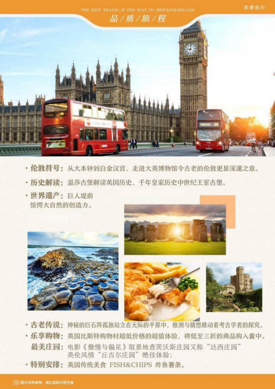 | 参考航班:C937 PEKLHR 1410/1745 飞行时间约12小时 (以出团通知为准)10:30 北京首都机场集合,届时我们的专业领队会举旗子等您;14:10 乘坐中国国际航空公司班机,飞往英国首都-伦敦;17:45 抵达机场,提取行李,专车接机;19:00 前往酒店休息调整时差,准备迎接精彩的旅程… |