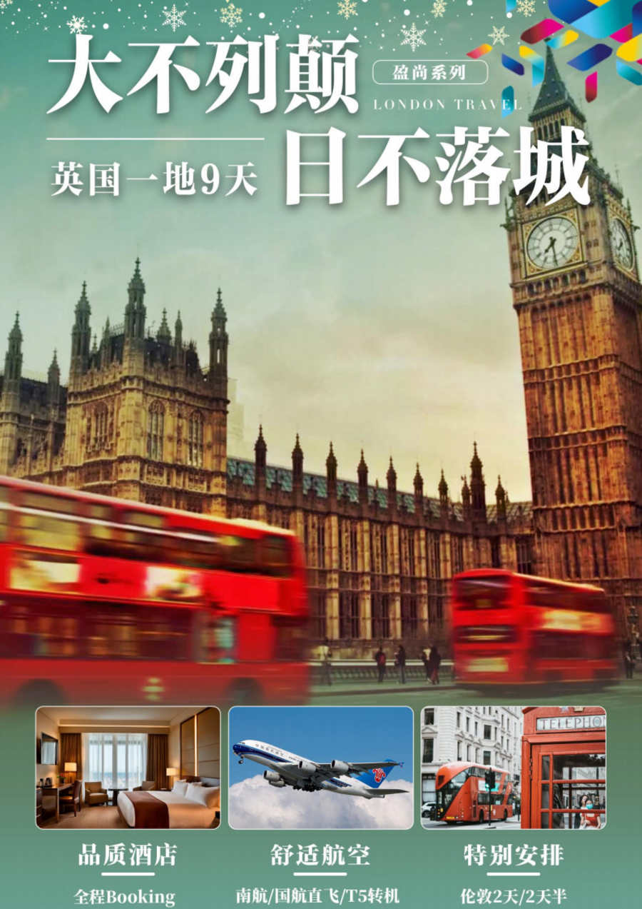 | 11:00 北京大兴国际机场集合,专业送团人召开出团前旅游说明会14:00 搭乘中国南方国际航空公司客机直飞伦敦17:20 抵达伦敦,专车接机随后前往酒店休息。 |