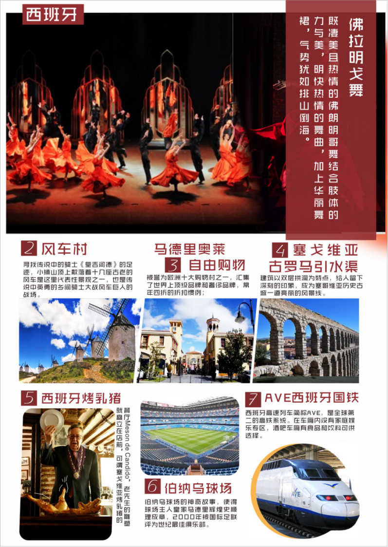 | 08:00 酒店享用西式早餐;09:00乘车前往著名绘画大师毕加索的故乡—马拉加,这里也是西班牙五大都市圈之一。参观毕加索博物馆{,博物馆里收藏有毕加索的233份油画、版画、素描、陶瓷等作品,从开始的学院派风格一直到70年代的各种作品都有覆盖,其中最有名的画就是《戴白帽子的保罗像》。抵达后外观马拉加大教堂位始建于16世纪,在17、18世纪时也有后续修建,是城内第一座基督教堂。南侧的塔楼一直没有建成,因而又被称作“独臂大教堂”;午餐自理;13:00 前往悬崖上的罗马古城、西班牙斗牛的发源地-龙达;游览连接新旧城区的努埃博桥(约30分钟),下面是100米深的峡谷,外观古老的龙达斗牛场,它是现代斗牛的发源地,这座仍在使用之中的斗牛场对于整个西班牙斗牛来说,具有圣地一般的意义。14:30 乘车前往塞维利亚;18:00 晚餐,六菜一汤.19:00前往参观佛拉明戈舞{,既凄美且热情的佛朗明哥舞是艺术之都巴塞罗那非常盛行的舞蹈,有许多吉普赛人游走糊口演出佛朗明哥舞,肢体的力与美,配着悲切急促、明快热情的舞曲,加上层层叠叠的华丽舞裙,气势犹如排山倒海。21:00 乘车前往酒店休息. |