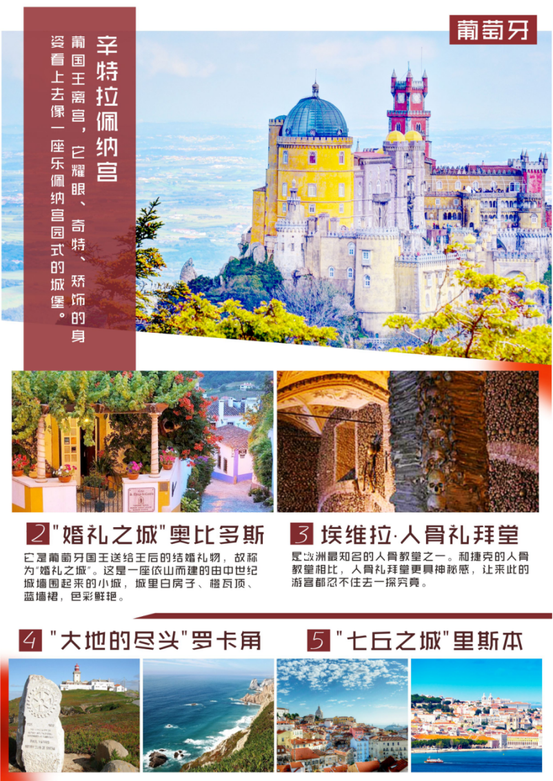 | 08:00 酒店享用西式早餐09:00乘车前往罗卡角游览,这里位于欧洲大陆的最西端,号称“大地尽头、海洋开端”11:00 乘车前往素有”伊甸园”之称的辛特拉,游览辛特拉佩纳宫{,葡萄牙国王离宫,它耀眼、奇特、矫饰的身姿看上去像一座乐佩纳宫园式的城堡。宫殿本身为多种建筑风格的大杂烩,兼具哥德式、文艺复兴式、摩尔式、曼努埃尔式。乃十九世纪葡萄牙女王玛丽雅二世的丈夫——费迪南德之心血结晶。于由于深具文化价值,佩纳宫于1995年获联合国教科文组织列为世界遗产。14:00 午餐,六菜一汤;15:00 乘车前往“婚礼之城”奥比多斯;16:00抵达后游览奥比多斯,它是葡萄牙国王送给王后的结婚礼物,故称为“婚礼之城”。这是一座依山而建的由中世纪城墙围起来的小城,城里白房子、橙瓦顶、蓝墙裙,色彩鲜艳。17:00乘车返回里斯本18:00晚餐特别安排葡萄牙特色餐19:00 前往酒店休息 |