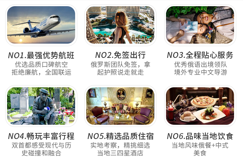 | 参考航班:HU7985 14:45-18:05北京首都国际机场集合,办理相关手续后,搭乘中国海南航空公司国际航班前往俄罗斯首都莫斯科,开启俄罗斯奇幻之旅。抵达后旅游大巴接机,送抵酒店休息。 |