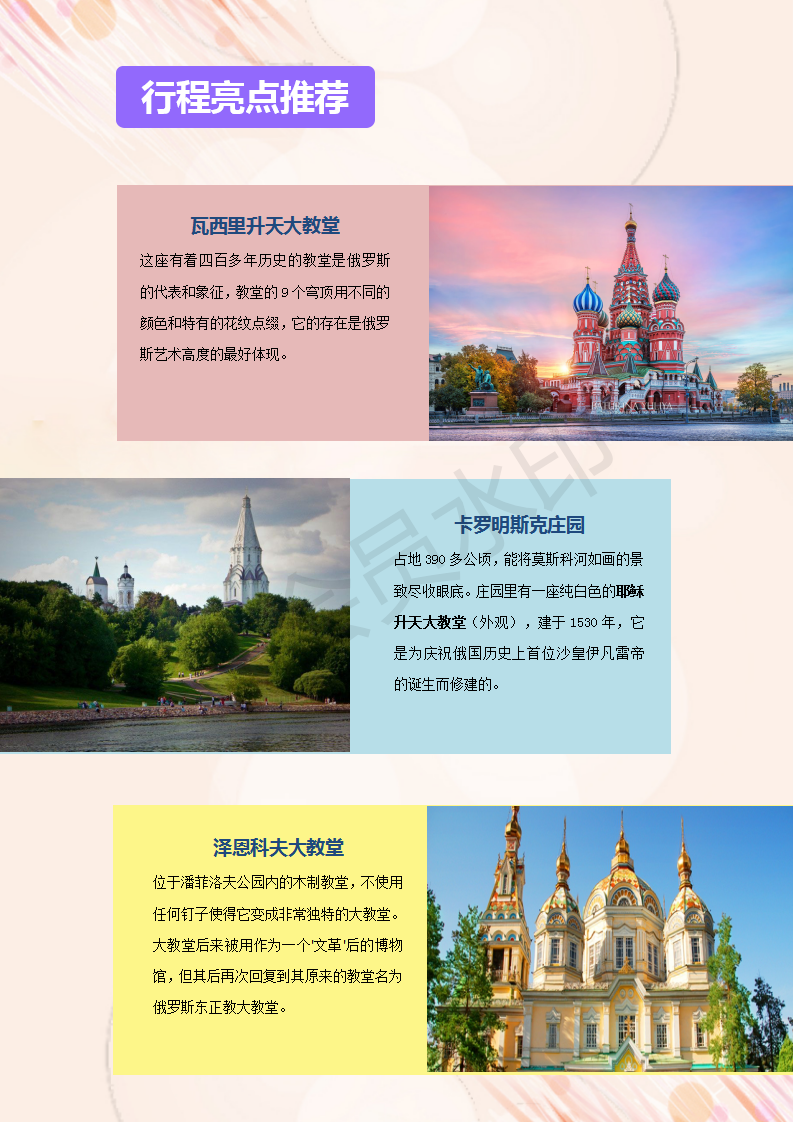 | 早餐后,前往参观红场(约1小时),主要景点:国家历史博物馆(外观)--瓦西里升天大教堂(外观)--古姆百货--列宁墓(视情况而定,自由活动时间内可自行入内参观,每周一、五闭馆)--克里姆林宫(外观,约为10分钟,每周四闭馆)--朱可夫雕像--亚历山大花园--无名英雄烈士墓及无名圣火。红场:是莫斯科最古老的广场,也是俄罗斯最美丽的广场。这里见证了许多重大历史事件的发生,如今是举行阅兵活动和大型庆典的地方。瓦西里升天大教堂:这座有着四百多年历史的教堂是俄罗斯的代表和象征,教堂的9个穹顶用不同的颜色和特有的花纹点缀,它的存在是俄罗斯艺术高度的最好体现。克里姆林宫(可自费入内):这里是整个莫斯科市的发端与起源,它曾是俄国沙皇的皇宫,现在是俄罗斯总统府和国家领导人的办公地点,1990年被联合国教科文组织列为世界文化和自然保护遗产。晚餐后,入住酒店休息。温馨提示:红场如遇举行政治活动或有特殊事件会临时关闭,无法参观。这种情况下我们不能提前通知,敬请谅解。 |