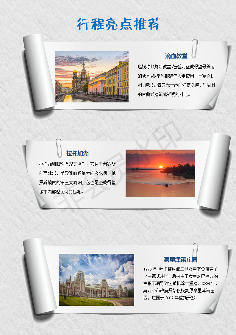 | 抵达后,乘车前往拉多加湖(车程约1.5-2小时,视路况而定)--狮身人面像(约10分钟)--瓦西里岛古港口灯塔(约15分钟)--彼得保罗要塞(入内,约40分钟,不进教堂和监狱)--冬宫博物馆(入内,约1.5小时)--冬宫广场及亚历山大纪念柱(约20分钟)。拉多加湖位于圣彼得堡东部,是欧洲最大的淡水湖,面积17700平方公里,共有660个岛屿。二战时著名的“生命之路”就开辟在拉多加湖上,这条连接了拉多加湖东西两岸的冰上运输线,成为列宁格勒取得外部支援的唯一通道,支持列宁格勒度过了长达900天的围困。沿途可以看到二战历史纪念碑,又被称为“被撕裂的包围圈”。拉多加湖保持着原始的自然风貌,湖水清澈透明,森林与湖泊融为一体,您可在此沿湖漫步,领略俄罗斯的大自然之美。冬宫博物馆(艾尔米塔什博物馆):它是18世纪中叶俄国巴洛克式建筑的杰出代表,艾尔米塔什博物馆与伦敦的大英博物馆、巴黎的卢浮宫、纽约的大都会艺术博物馆并称为世界四大博物馆。冬宫博物馆以其宏伟的气势、非凡的想象、华丽的景观动人心魄。彼得保罗要塞:是圣彼得堡的发源地。它坐落在市中心的涅瓦河右岸,后几经扩建,建成了这座六棱体的古堡。要塞曾作为沙皇俄国的“巴士底狱”关押政治犯,而其中的彼得保罗大教堂是圣彼得堡最高的教堂,也是俄国罗曼诺夫王朝的沙皇陵寝所在地。晚餐后,入住酒店休息。注:当天早餐为火车上简餐或中式早餐。 |