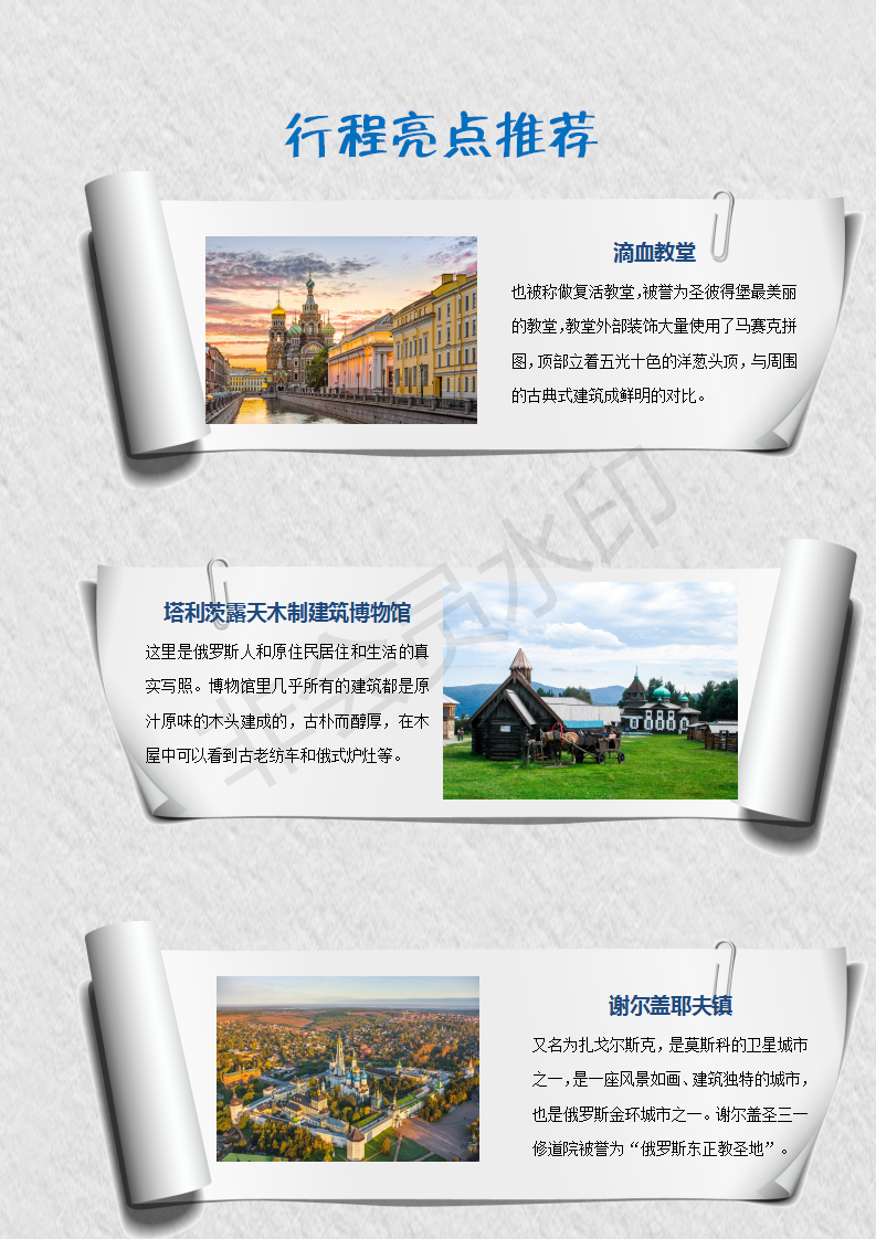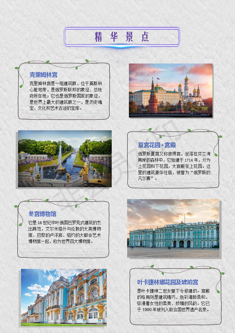| 早餐后,前往参观红场(约1小时),主要景点:国家历史博物馆(外观)--瓦西里升天大教堂(外观)--古姆百货--列宁墓(视情况而定,自由活动时间内可自行入内参观,每周一、五闭馆)--克里姆林宫(入内,约为40分钟,每周四闭馆)--朱可夫雕像--亚历山大花园--无名英雄烈士墓及无名圣火。红场:是莫斯科最古老的广场,也是俄罗斯最美丽的广场。这里见证了许多重大历史事件的发生,如今是举行阅兵活动和大型庆典的地方。瓦西里升天大教堂:这座有着四百多年历史的教堂是俄罗斯的代表和象征,教堂的9个穹顶用不同的颜色和特有的花纹点缀,它的存在是俄罗斯艺术高度的最好体现。克里姆林宫(入内):这里是整个莫斯科市的发端与起源,它曾是俄国沙皇的皇宫,现在是俄罗斯总统府和国家领导人的办公地点,1990年被联合国教科文组织列为世界文化和自然保护遗产。晚餐后,入住酒店休息。温馨提示:红场如遇举行政治活动或有特殊事件会临时关闭,无法参观。这种情况下我们不能提前通知,敬请谅解。 |