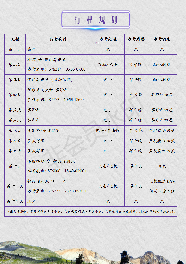 - 重要提示:以下为参考行程。鉴于旅游存在一定不确定性,我司或航空公司有时无法提前提供合同中航班、酒店等某些细节和具体信息。详细>>