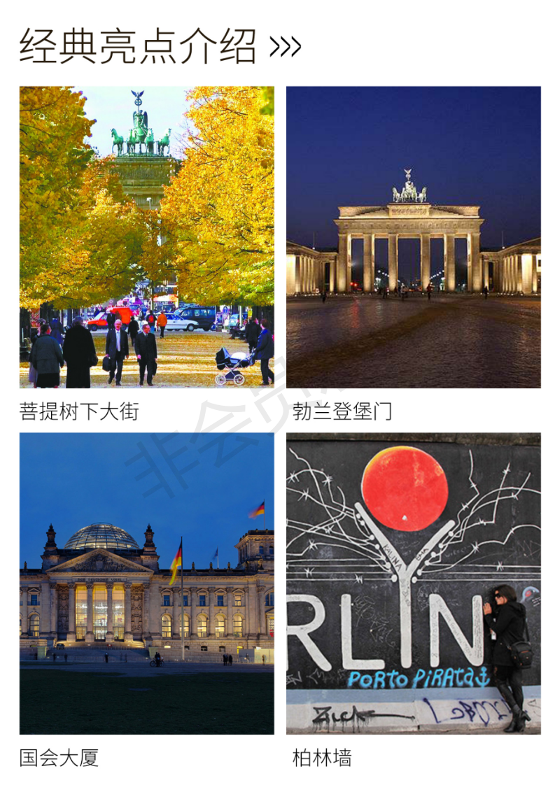 | 参考航班:HU490 1940 1050+1 08:00 酒店早餐09:00 参观游览菩提树下大街(拍照留念 10分钟),是德国首都柏林的著名街道,也是欧洲著名的林荫大道。勃兰登堡门(拍照留念5分钟),位于柏林市中心菩提树大街和6月17日大街交汇处,是柏林的标志建筑。德国国会大厦(外观)现在不仅是联邦议会的所在地,其屋顶的穹形圆顶也是最受欢迎的游览圣地。12:00 午餐13:00 柏林墙(拍照留念15分钟)正式名称为反法西斯防卫墙(antifaschistischer Schutzwall),柏林墙的建立,是二战以后德国分裂和冷战的重要标志性建筑。特别赠送:夏洛腾堡宫外观+花园 夏洛腾堡宫位于露丝广场,是一座巴洛克式宫殿,是柏林地区保存得最好、最重要的普鲁士国王宫殿建筑物。17世纪末,其花园为法国风格,18世纪末,部分花坛改成英式园林。15:00 乘坐巴士前往机场办理登机手续,搭乘国际航班飞回首都北京。 |