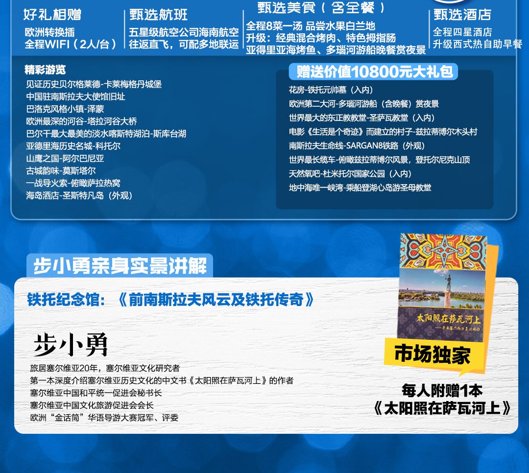 | 清晨抵达后,游览欧洲最古老城市之一的贝尔格莱德。这里被称为“东西方世界的十字路口”、“巴尔干的大门”、“中欧的大门”,多瑙河与萨瓦河正是在这里相爱拥吻。【圣萨瓦教堂(入内)】前往世界上最大的东正教教堂,教堂可分为新旧两部分:旧教堂内彩绘壁画,充分表现艺术精华,而新教堂外型雄伟,以伊斯坦堡圣索非亚教堂为蓝本而建。【铁托元帅墓(入内)】铁托元帅墓别名花房,是一代伟人的安之地,由于铁托生前酷爱养花,因此在他死后就将他的遗体埋葬在花房中。是个墓园,也是一个博物馆。整个博物馆由三部分组成,“5 月 25 日”博物馆,老博物馆和铁托墓。因为铁托生日是 5 月 25 日,所以主博物馆被命名为“May 25th”,里面常年有展览,铁托墓是一座白色大理石砌成的长方形陵墓,陵墓正上方镶有三行镏金大字:约西普·布罗兹,铁托,1892-1980。(特别提示:如遇周一铁托墓关闭,则现退门票费用。)【泽蒙小镇-天鹅湖】一片世外桃源般的开阔景致。泽蒙曾是奥匈帝国最后的边境,在多瑙河畔喂天鹅,成群的天鹅、海鸥、鸳鸯和鸽子,在波光粼粼中自在游弋,感受当地集市。【卡莱梅格丹城堡(外观)】位于老城区西北角,是中世纪时期贝尔格莱德的重要堡垒,由萨瓦河和多瑙河交汇处的旧城堡和卡莱梅格丹公园组成。该城堡历史上曾经过多次修缮和扩建,至今仍可见古罗马、奥匈帝国的建筑遗风,是学习历史知识、感受古老建筑的好选择。【米哈伊洛大公街】坐落在贝尔格莱德市中心,紧邻卡莱梅格丹公园,是市内最负盛名的商业街,算是贝尔格莱德的主街了。【多瑙河游船(含晚餐)】多瑙河是欧洲第二大河,仅次于俄罗斯的伏尔加河,发源于德国黑森林地区,注入黑海,全长 2857 千米,流域面积 81.7 万平方千米,平均流量 6500 立方米/秒。乘坐游船穿梭于无人打扰的小岛与两岸城市的建筑中。晚餐后,入住酒店休息 |