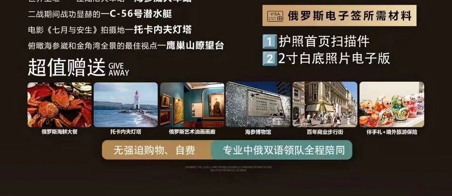 | 早餐后,参观景点海参崴火车站它雄伟壮观,是西伯利亚大铁路的终点站,是横跨欧亚大陆世界上最长的一条铁路,西起莫斯科,东至海参崴,穿越 87 个城市,16 条河流。陆港码头世界上唯一的陆港火车站,它是西伯利亚大铁路的终点站点也是远东地区铁路的起点,西伯利亚大铁路是横跨欧亚大陆世界上最长的一条铁路。西起莫斯科,东至海参崴,穿越 87 个城市、 16 条河流蒸汽火车头它是为纪念二战时期英勇的铁路工人设立的实物纪念碑。火车头由俄罗斯人设计,在美国制造,通过太平洋运抵这里。 在二战期间,这台机车发挥了很大的作用。许多铁路工人在空袭中壮烈牺牲。西伯利亚大铁路终点 9288 纪念碑 9288 纪念碑建立在俄罗斯海参崴火车站站台上,是为了纪念被称为“世界第十二大奇迹”的西伯利亚大铁路而建。碑高四米左右,高高的尖顶上安放着俄罗斯双头鹰国徽,碑身由下方上圆的几何形状组合而成。黑色大理石上镶嵌着“9288”四个黄灿灿的铜字,标志着横贯欧亚两大洲的西伯利亚大铁路的终点与首都莫斯科的距离是 9288 公里。列宁像、市中心广场、列宁广场、参观十月革命英雄纪念碑俄罗斯远东最大的纪念碑,为了纪念 1917 年 2 月和 7月革命,用鲜血和生命赢得了最后胜利的英勇战士们。参观百货大楼、首饰店各式各样的服饰,别具风格的饰品,可以为亲朋好友选购礼物作为留念。海参博物馆 海参博物馆面积 1000 平,位于海参崴阿穆尔湾,是一座集世界各地海参标本展示、海洋生物研究和科普教育为一体的专业化展馆,也是集物产资源与人文资源于一体的旅游景点。对每种海参的名称、属种、产地、生长环境、体貌特征、习性和营养及经济价值进行了详尽的阐述,馆内还展示了采捕海参的工具以及采捕的过程 。晚餐后 回宾馆休息自由活动。托卡内夫灯塔(Tokarev Light)是海参崴的标志性建筑,俄罗斯最著名的灯塔。这是陆地的尽头、太平洋的起点!站在这里,感受《七月与安生》的重生和自由的喜悦! |