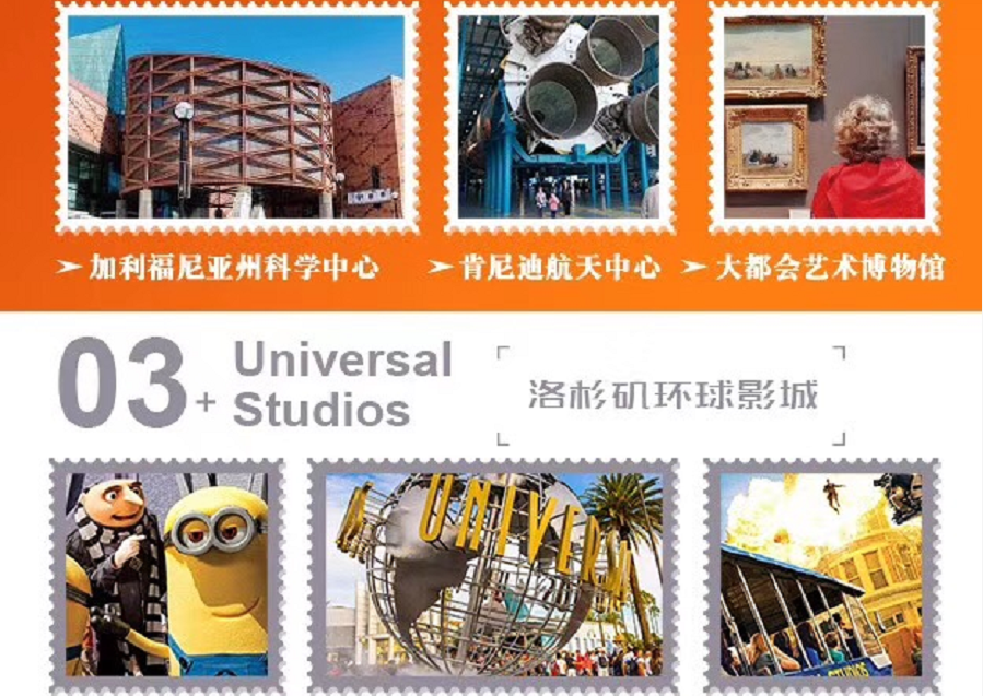 | 早餐后乘车前往【加利福尼亚州科学中心】(约1.5小时),是一个综合性的科普场所,展馆分为科学殿堂、生命世界、创造力世界、经验积累、穹幕电影厅等部分。富有科学气息的广场和序厅被称为科学殿堂,使人们在进入展厅之前就已经融入科学的氛围之中。博物馆的IMAX影院和动手展览对孩子们有很大的吸引力。生命世界是科学中心比较大,也是内容最丰富的展区,通过生命过程、生命起源、细胞实验室、能量工厂、消化系统、供给网、控制中心、人体工程等项目向公众介绍了生命科学方面的知识,【南加州大学】(约40分钟)是美国西海岸最古老的顶尖私立研究型大学,世界著名高等学府。游走在学院间,学生们熙熙攘攘的坐在草坪上谈笑风生,沐浴着饱满的阳光。【迪士尼音乐厅】(约15分钟):强烈的盖瑞金属片状屋顶风格,是洛杉矶的爱乐合唱团的本部,其独特的外观使其成为洛杉矶地标之一。【洛杉矶市政厅】(约15分钟)在1928年落成后在长达20余年内都是西海岸高建筑,这座建筑主体全部使用加州本地的土壤及水源,顶部的塔楼效仿古代世界奇迹的摩索拉斯陵墓,使得大楼独具特色,成为众多电影的拍摄地,《超人》中主角工作的报社就在这里,【斯坦普斯中心】(约15分钟):号称“世界体育和娱乐中心”,是洛杉矶湖人,快船,火花,国王队共同的主场。【圣塔莫尼卡+66号公路终点】(约1小时)前往加州吸引人的海滨城市圣塔莫尼卡,这是一个繁华都市和自然美景共存、冬暖夏凉的度假胜地。爱海的朋友可以徜徉在碧蓝的海洋旁、苍翠的椰子树下、洁白的沙滩上,阵阵海风迎面吹拂,轻吻骄阳。岸边林立着大大小小的酒店、商场、电影院和餐馆。热爱购物和享受美食的朋友可以很容易地找到自己的一片天。圣莫妮卡的66号终点的标志,著名电影《阿甘正传》里,阿甘长跑的终点站也是在此,一定要在这条伟大公路的终点标志牌下拍照留念,【格里菲斯天文台】(约1小时):位于格里菲斯公园中,为洛杉矶的地标之一,与1935年开放,可一览洛杉矶的全景。今日特别安排前往洛杉矶精品店活动(约1小时)今日特别安排美国超人气的汉堡In-N-Out汉堡餐In-N-Out之前曾在伦敦做过限量销售,排队时间长达 5 小时,而新加坡的快闪店则在5分钟内就售罄 |