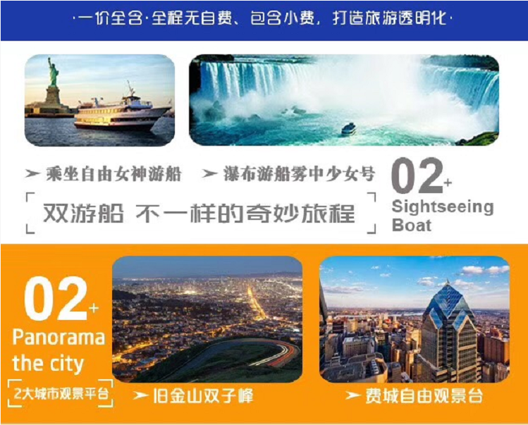 | 早餐后乘车前往【尼亚加拉大瀑布】(约60分钟)。瀑布位于加拿大和美国交界的尼亚加拉河中段地区,有着世界七大奇景之一的美誉,同时也是世界三大瀑布之一。它以宏伟的气势,丰沛而浩瀚的水汽,震撼了所有的游人。从伊利湖滚滚而来的尼亚加拉河水流经此地,突然垂直跌落51米,巨大的水流以银河倾倒之势冲下断崖,声及数里之外,场面震人心魄,形成了气势磅礴的大瀑布。赠送 “雾中少女号”游船,感受瀑布的壮观。之后乘车前往纽约(新泽西州)晚入住酒店休息。(温馨提示:今日车程时间较长,行程较为辛苦,请做好准备。) |