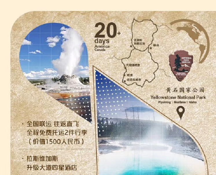 | 早餐后,前往“美国国家公园的冠上明珠”—黄石国家公园。首先游览诺里斯间歇泉盆地(约30分钟)诺里斯间歇泉黄石公园里最热最不稳定的一系列间歇泉,世界上最大的间歇泉 Steamboat Geyser 也位于此区,它长期蛰伏,很久才喷发一次(上次喷发为2008年),它曾创造了喷发高度的记录380英尺。之后接着前往黄石公园内最精华的部分【峡谷区】(约1 小时),黄石峡谷和黄石瀑布是黄石公园著名景观之一,可以同时观赏壮观深邃的峡谷风光和飞流而下的瀑布,黄石峡谷长32公里,宽约450-1200公尺,深达360公尺,长期的河水冲刷形成了色彩瑰丽的岩壁,呈现出黄、橙、棕、褐等,印第安人称之为“黄石”。随后去观赏的【泥火山】(Mud Volcano)(约20分钟),又是另一番景象,平静时如一潭死水,喷发时则泥浆涌动,酸雾密布。这里是黄石硫磺浓度高的区域,喷发的洞窟旁边,形成了一个个硫酸湖,湖边结着许多黄色的硫磺结晶。游览【豆浆池】(Fountain Paint Pot)(约20分钟)这里因它的多彩泥浆而得名。之后前往美国最大的热泉,也是世界第三大热泉,它被命名为“最美的地球表面” 大棱镜热泉游览(约30分钟)。1871年,它被地质学家发现,并因其醒目的色彩而被命名为大棱镜,温泉水中富含矿物质,使得水藻和菌落中带颜色的细菌在水边得以生存,从而呈现了这些色彩。从里向外呈现出蓝、绿、黄、橙、橘色和红色等不同颜色,最后前往老忠实喷泉(约1 小时),老忠实喷泉常年以来因其很有规律地喷发而得名。从它被发现到现在的100多年间,每隔33-93分钟就会喷发一次,每次喷发持续四至五分钟,水柱高达40多米,从不间断。(注:以上为描述性语言,如遇黄石公园内修路或部分景点关闭,导游会根据实际情况调整游览内容,请各位游客理解并配合) |