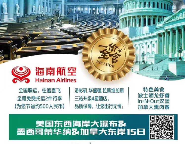 | 参考航班:待定乘机前往华盛顿,晚入住酒店休息。温馨提示:由于航班不确定因素,全天餐食自理,美国国内航班不提供餐食,请提前预备。 |