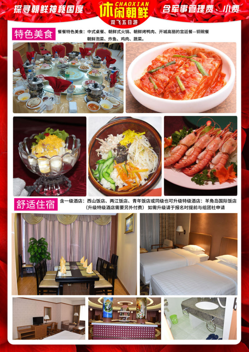 | (JS152*中国13:00/朝鲜16:00)(飞行时间2小时左右 时差1小时)(以上为参考航班,最终航班以实际出票时间为准)北京首都机场乘机前往朝鲜首都—平壤!抵达后,专车接机,前往市内晚餐后,返回酒店休息。 |