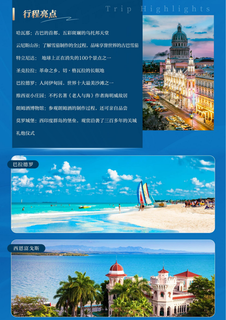 | 参考航班:CA865 PEK/HAV07:00-18:30(经停马德里)提前三小时抵达首都国际机场,办理登机手续,乘坐中国国际航空公司航班飞往古巴首都— 哈瓦那,经停西班牙首都马德里。 |