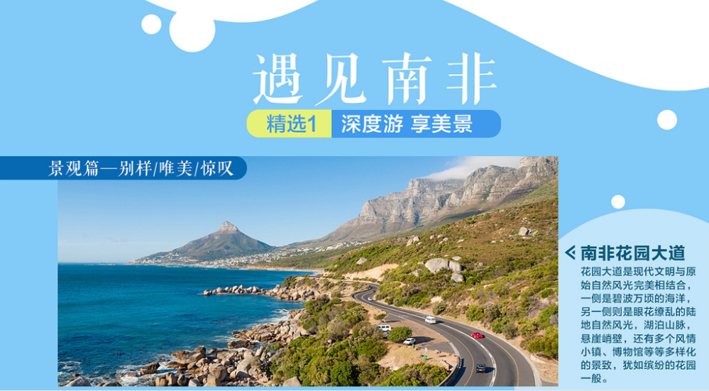 | 酒店早餐后,延花园大道继续东行,前往著名的齐齐卡玛国家公园(约1小时)齐齐卡马国家公园是一座独立的海上国家公园,建立于2009年,拥有长达80公里的海岸线,是南非最受欢迎的国家公园之一,是亲近自然,净化心灵的最佳选择。公园内有许多景点或娱乐项目都获得世界纪录和地区排名,每年都有大批国内外游客到此“历险”。之后乘车延花园大道继续东行,沿途游览花园大道东段俊美风景,并车览南非最大以及世界最最著名的海滩之一—杰弗里斯湾(Jefferys Bay),它的水上运动很受游客欢迎。许多人来到这个地方享受休闲时光,之后前往以“友好城市”著称的伊丽莎白港,作为世界上排名第四的拥有最佳气候状况的城市,伊丽莎白港终年是沙滩爱好者和酷爱海上运动的人的天堂,抵达后市区观光。晚餐后入住酒店 |