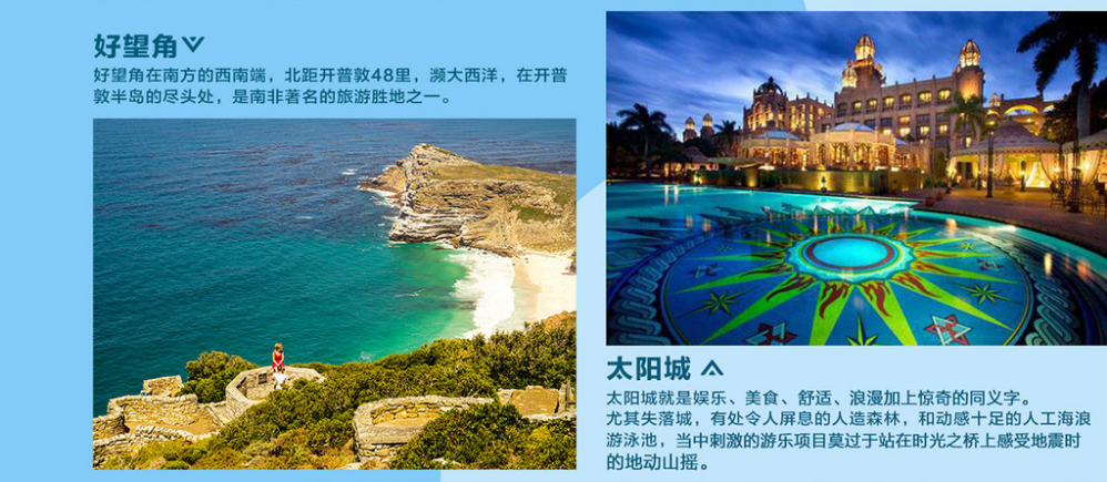 | 酒店早餐后,参观南非最古老街心花园,最著名圣乔治大教堂以及南非议会及总统府(外观30分钟)。前往2010世界杯比赛场地,绿点球场-GREEN POINT(外观20分钟)。之后驱车前往大西洋沿岸的豪特湾,途经车览拍摄12门徒峰。乘游轮前往海豹岛(乘船游览,约45分钟)(视天气情况而定),游人可以观赏到汪洋中的礁石上栖息着数以万计的海豹的壮观奇景;午餐后前往企鹅海滩(入内参观约45分钟)游览;随后前往非洲大陆最南端的天之涯、海之角-好望角自然保护区(入内参观约1个半小时);这里依然保持着原始风貌,游人可登上238米高的开普角山顶,纵览大西洋,印度洋交汇处,水天一色,烟波浩渺。晚餐品尝中式鸵鸟肉+鲍鱼片餐,晚餐后送回酒店休息。 |