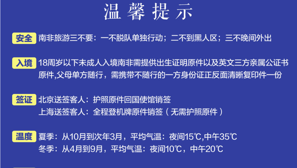 | 抵达首都国际机场,结束愉快的南非旅程。温馨提示:抵达北京后,请您配合南非使馆工作,将护照原件交给随团领队或我社接机工作人员,以便签证消签。 |